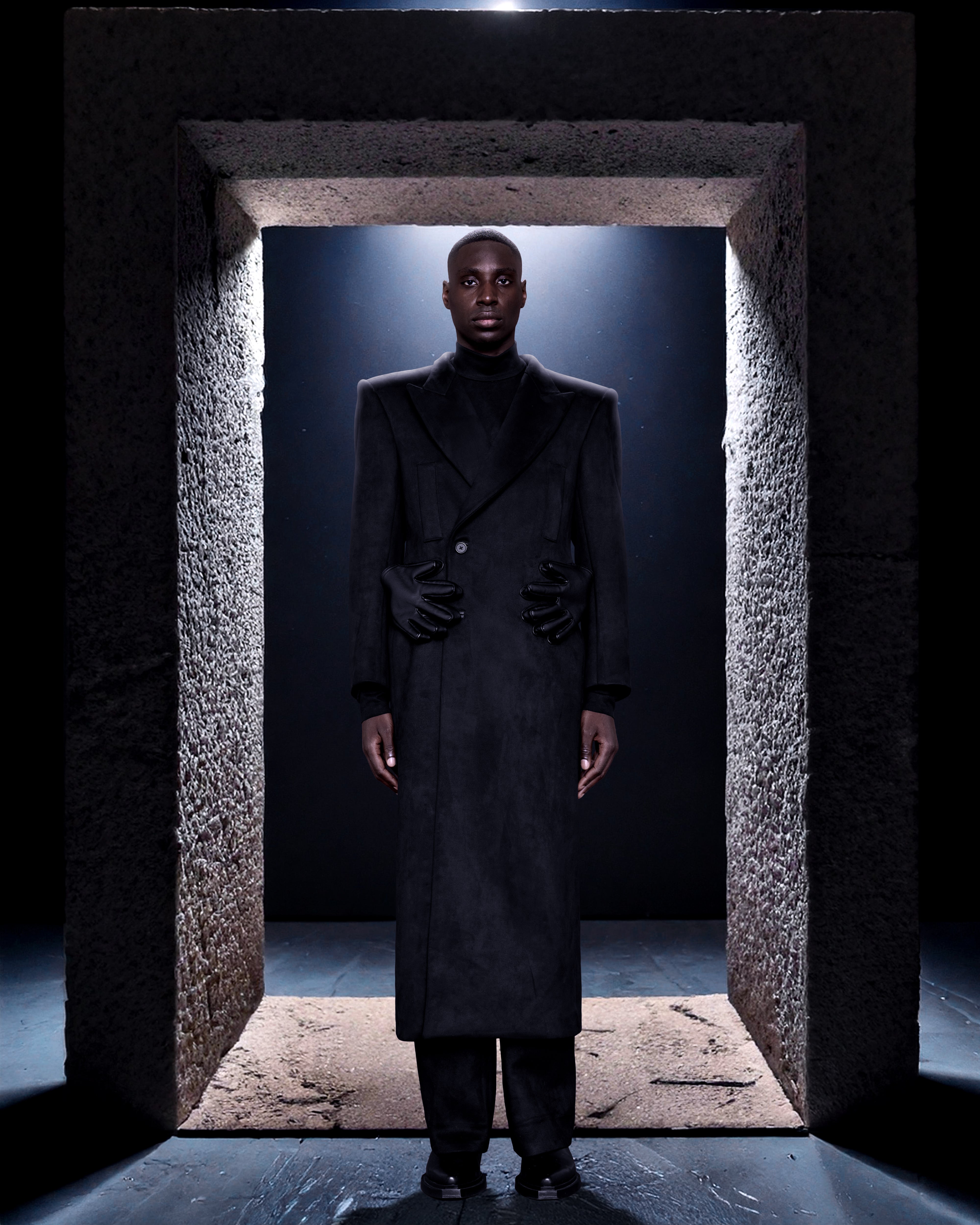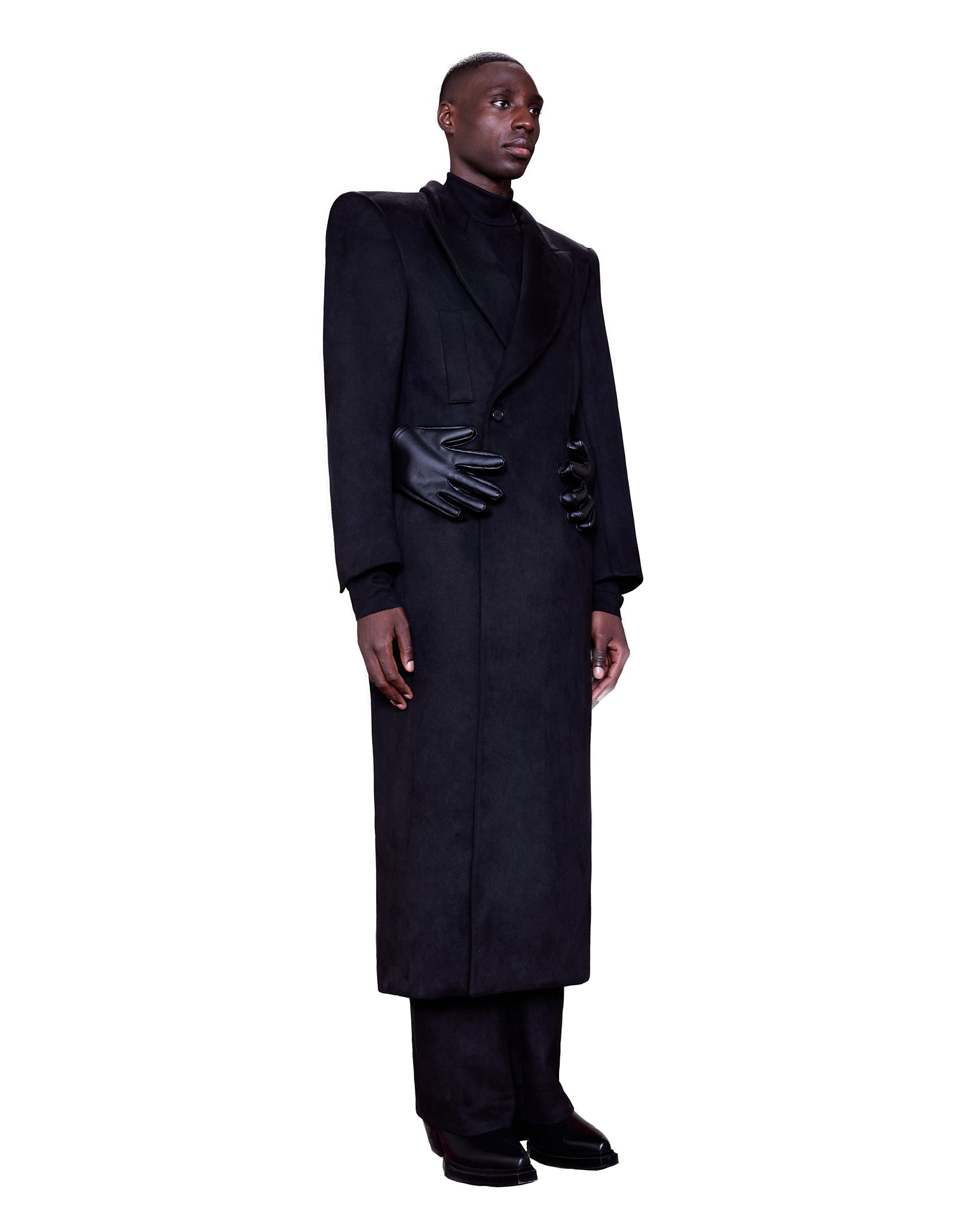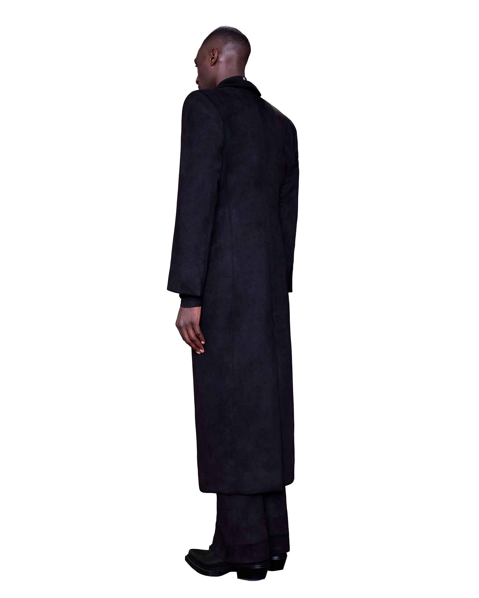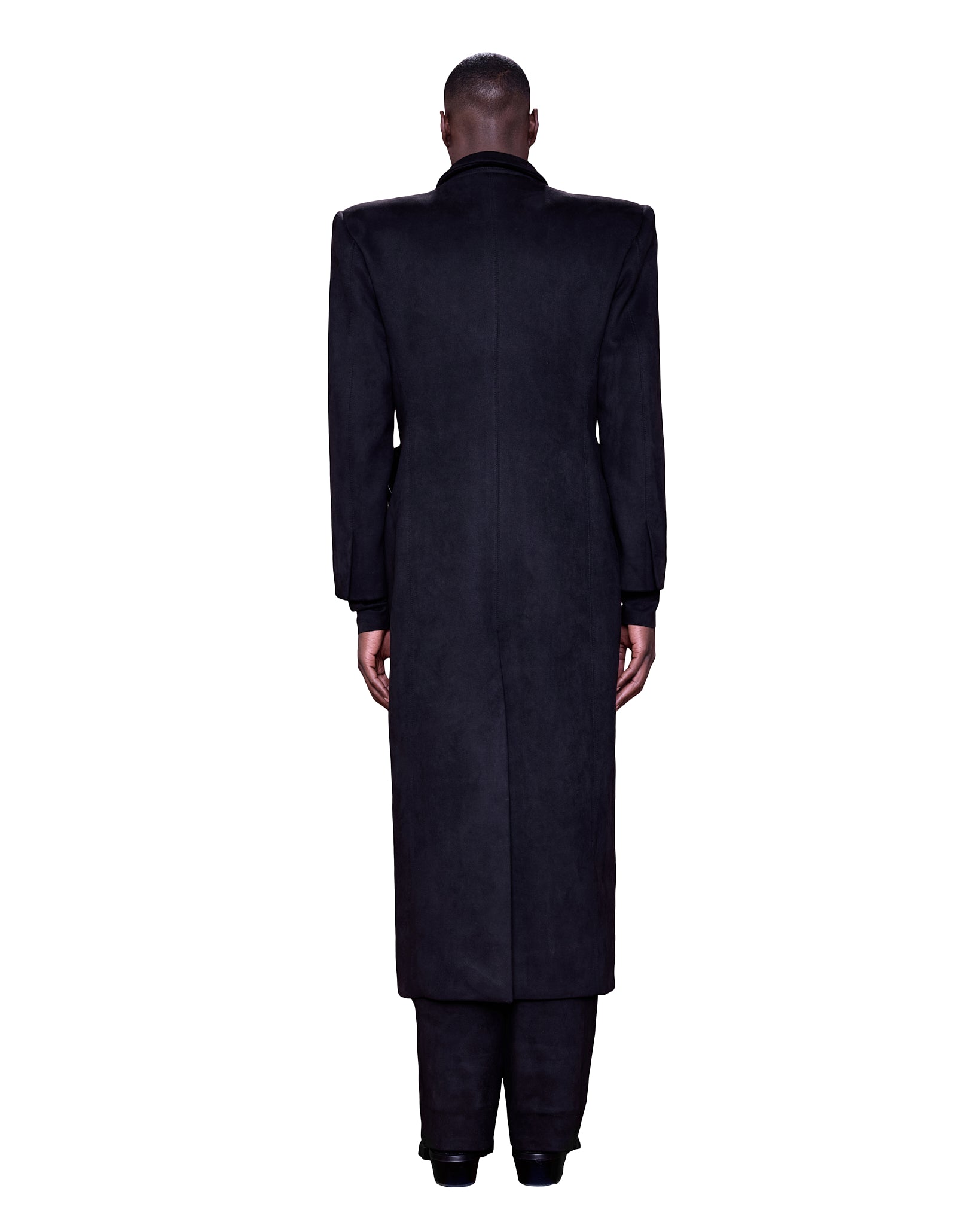 A full-length black coat, sculptural piece crafted from a deep matte black suede fabric with a soft, structured drape, the silhouette is sharply tailored with wide, angular shoulders and a classic peak lapel. A subtle single-breasted closure that keeps the overall composition clean and monolithic.