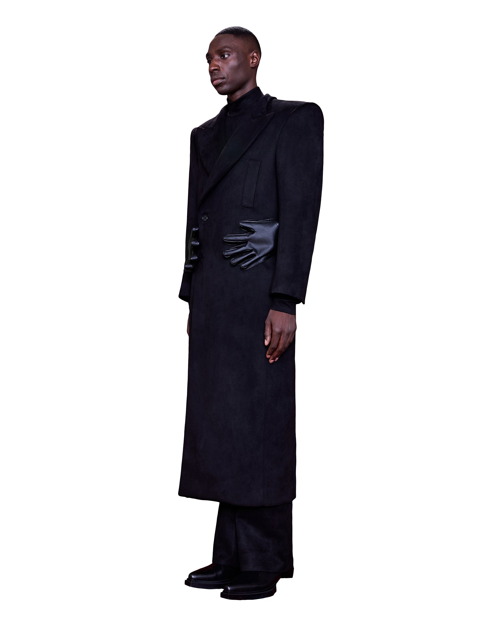 Detailing a pair of black leather gloves gripping the waist—adds a surrealist touch. This unexpected embellishment transforms the piece from classic outerwear into a conceptual garment.