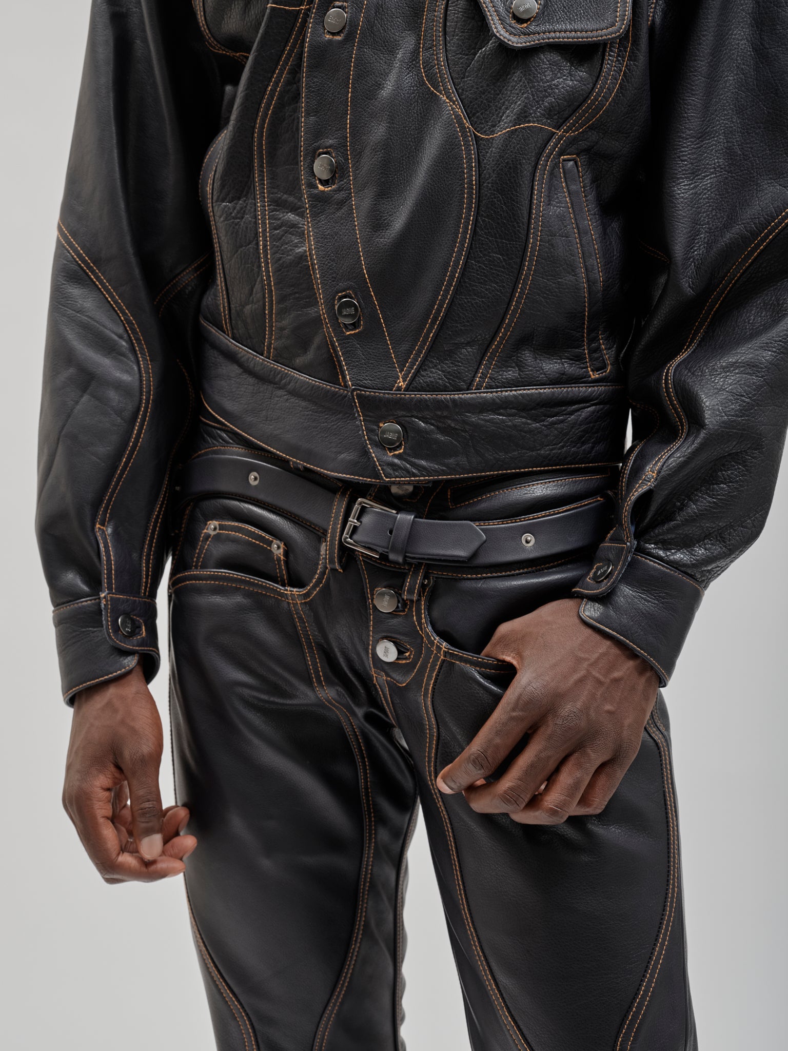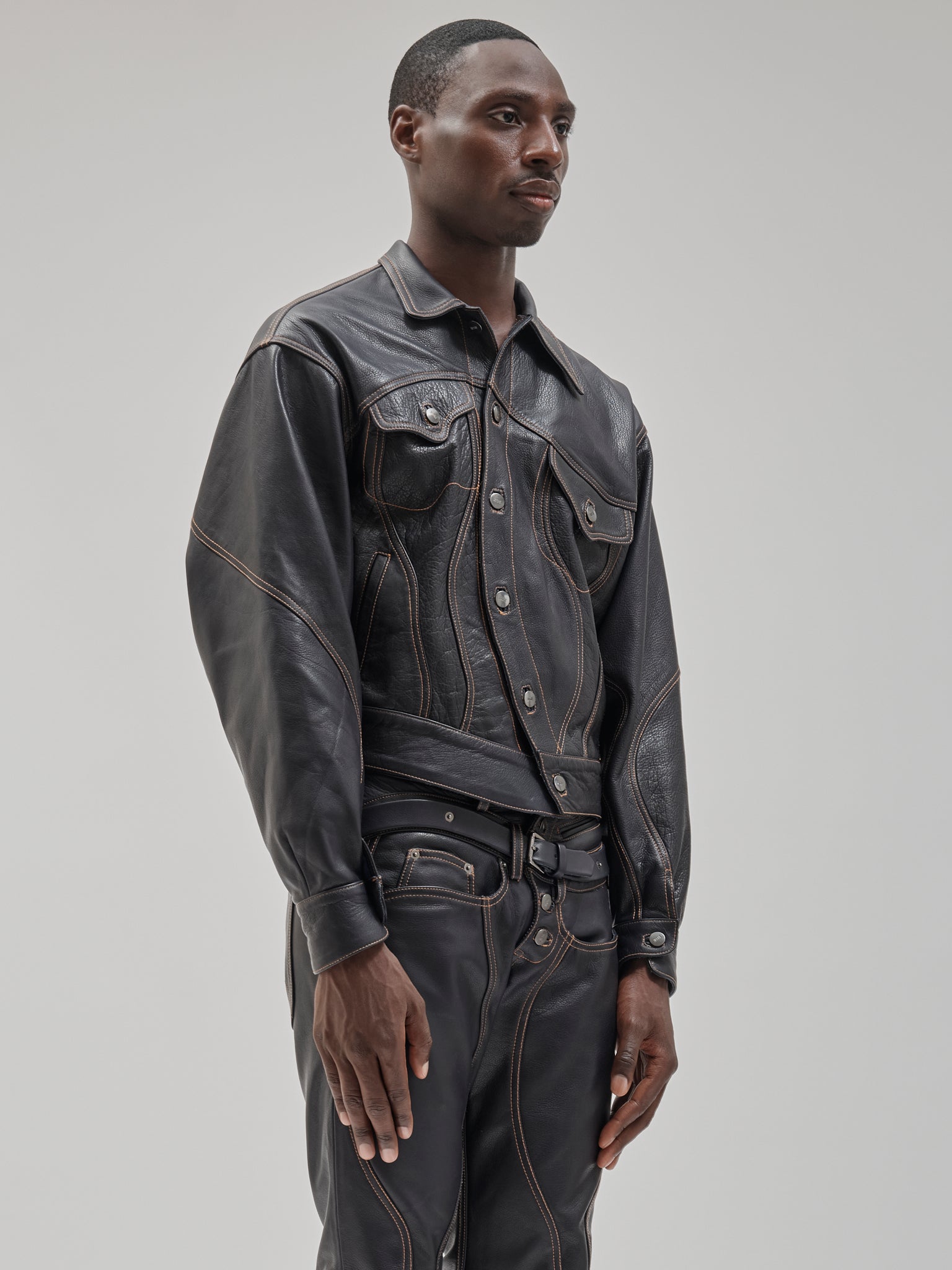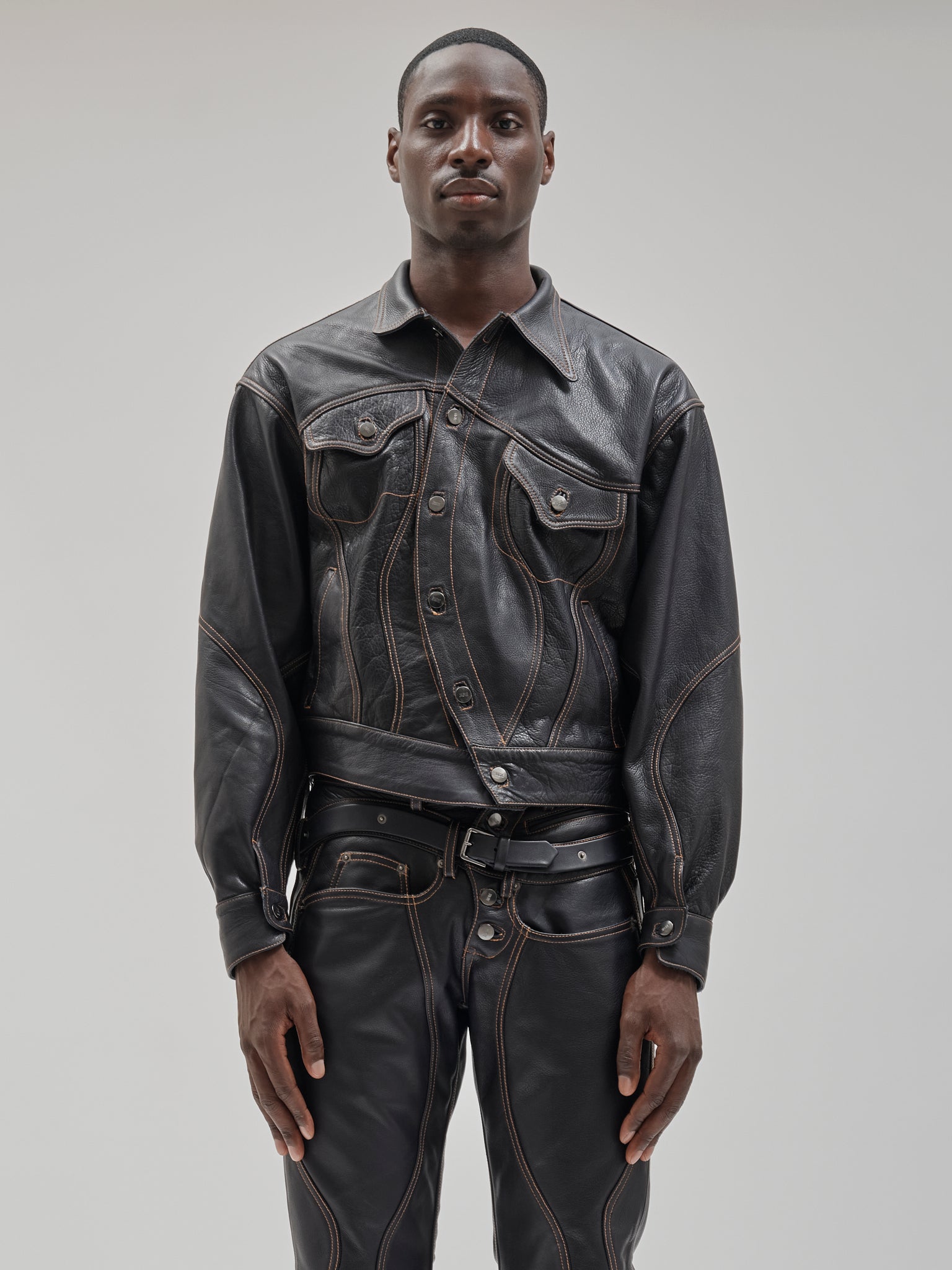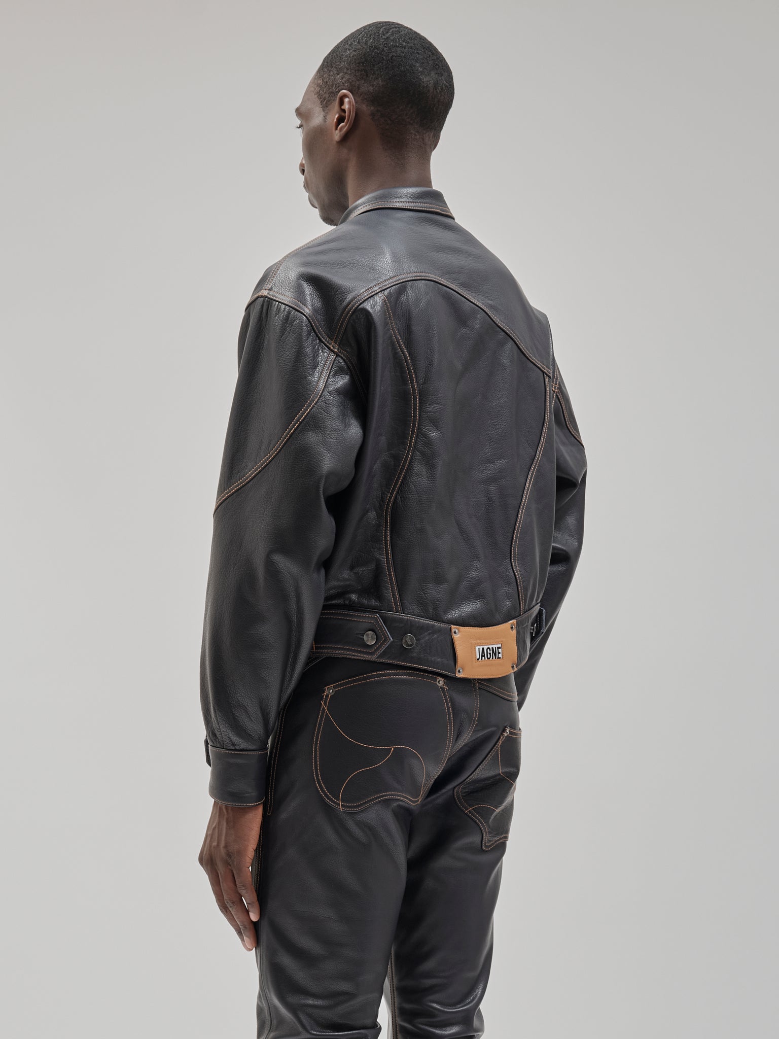 Articulated leather trucker cut along anatomical seam lines. A classic form re-engineered through structure and contour.