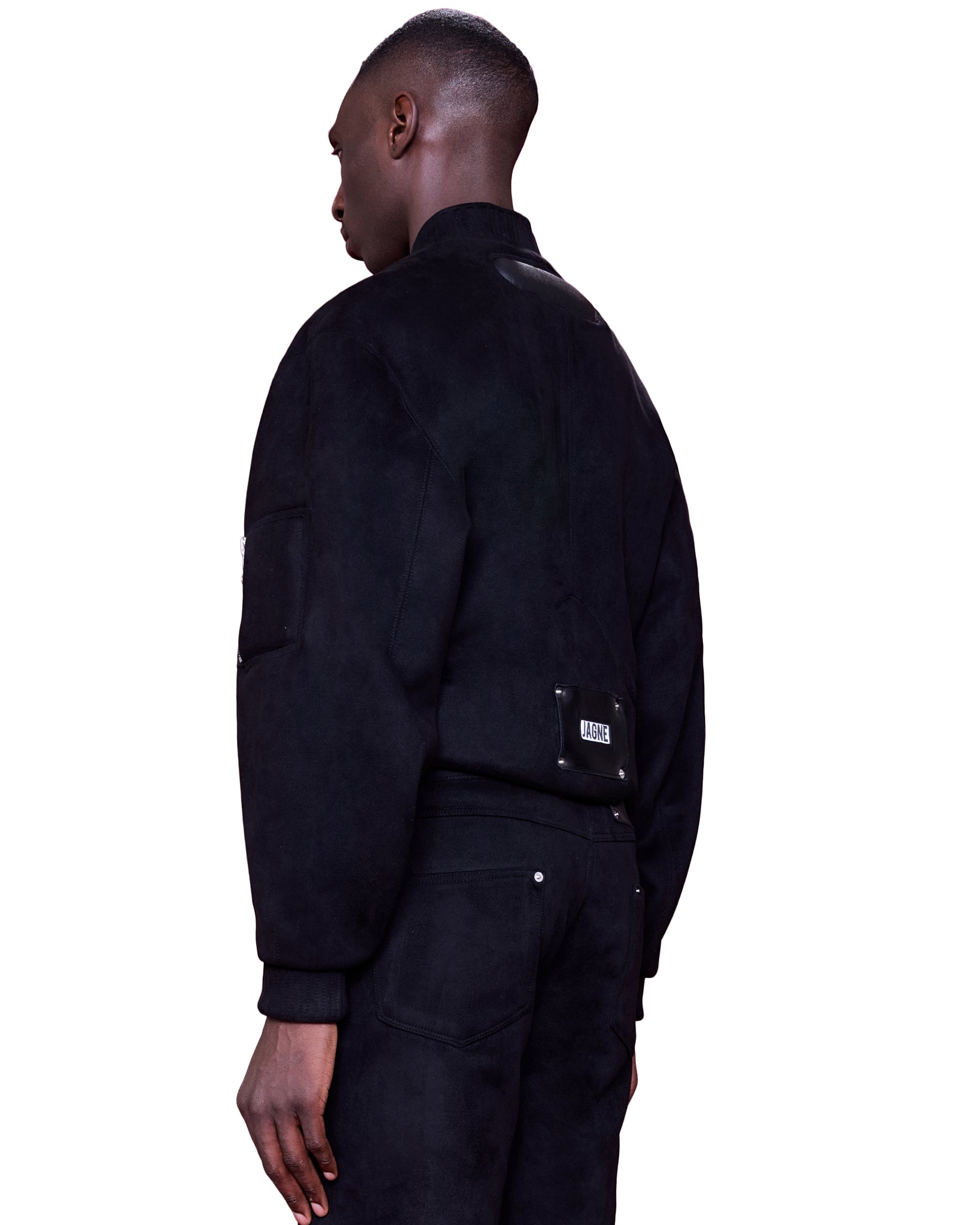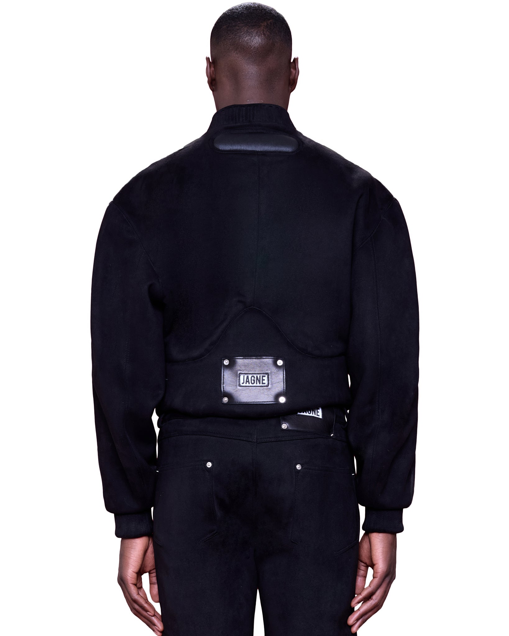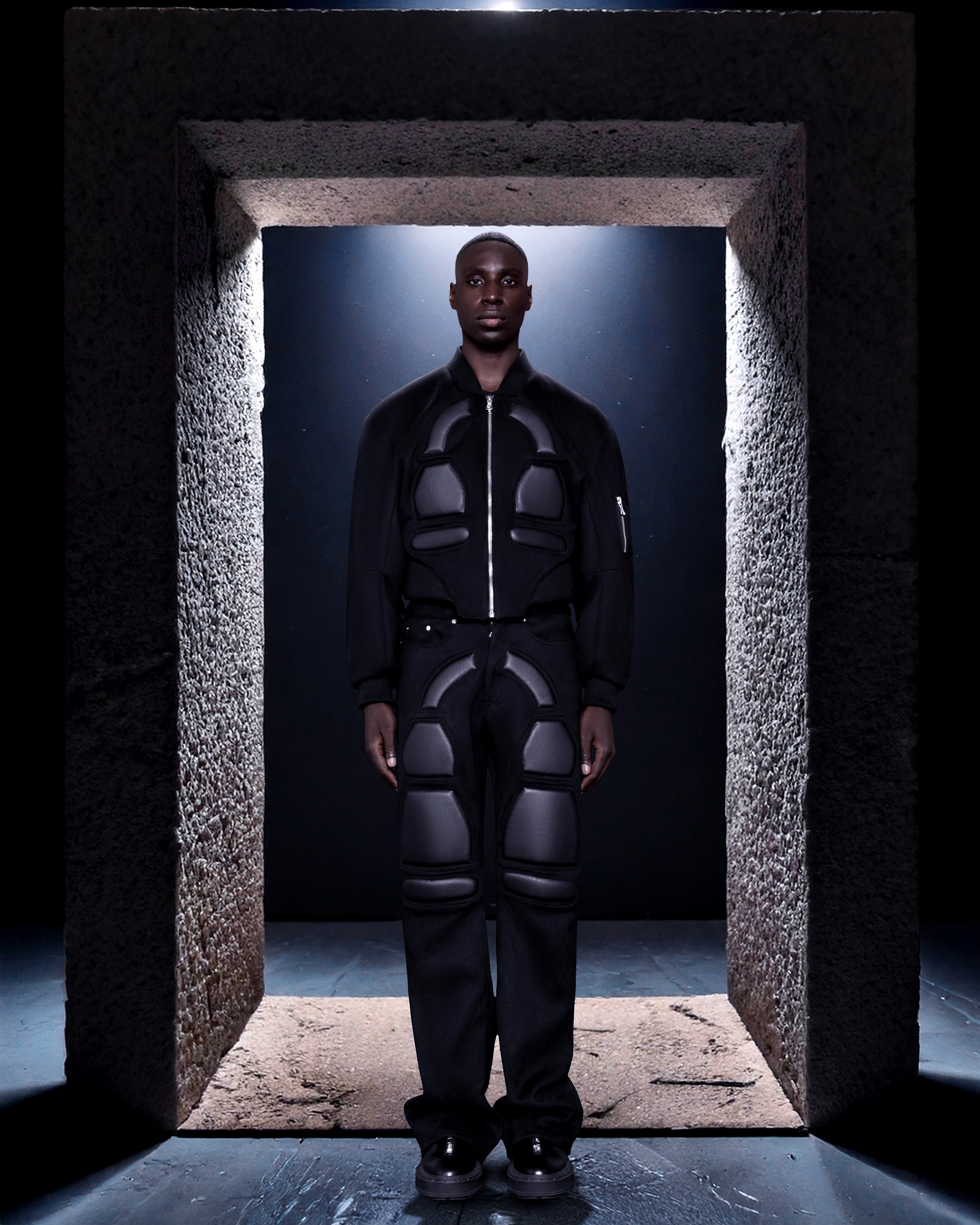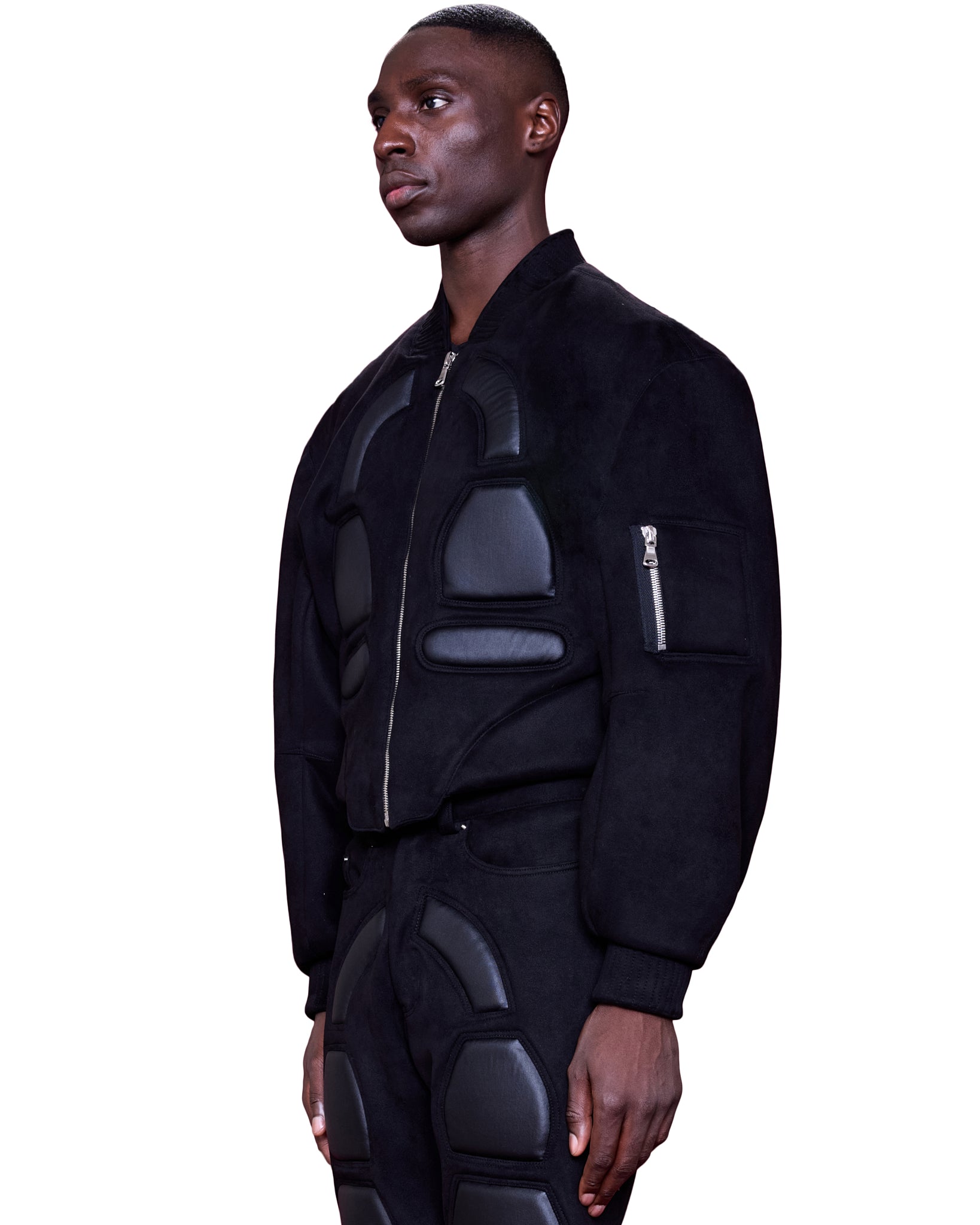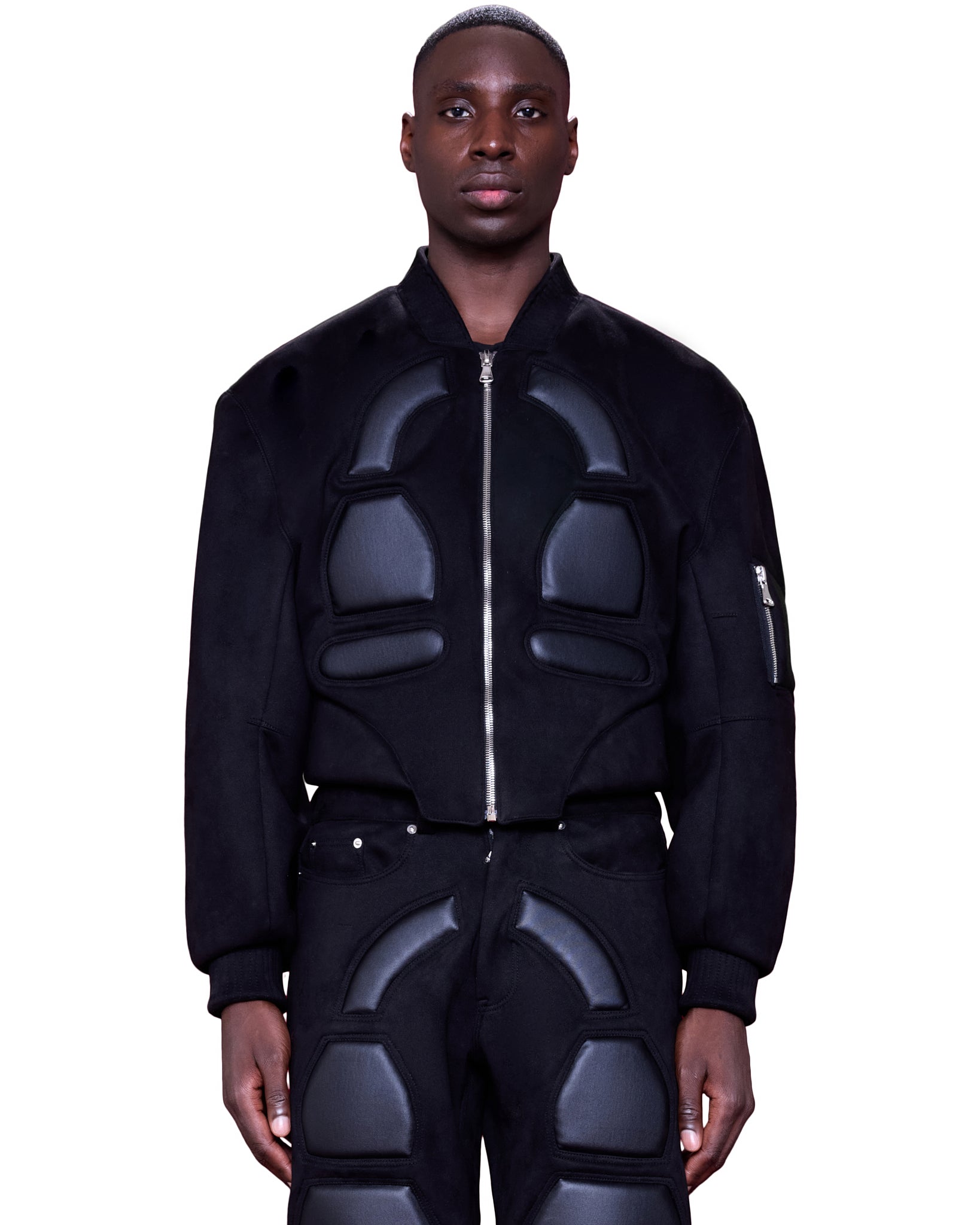 A conceptual bomber jacket with padded anatomical paneling across the chest and shoulders. Constructed from matte black fabric with tonal texture contrast, it blends utilitarian flight wear with body armor references for a futuristic silhouette.