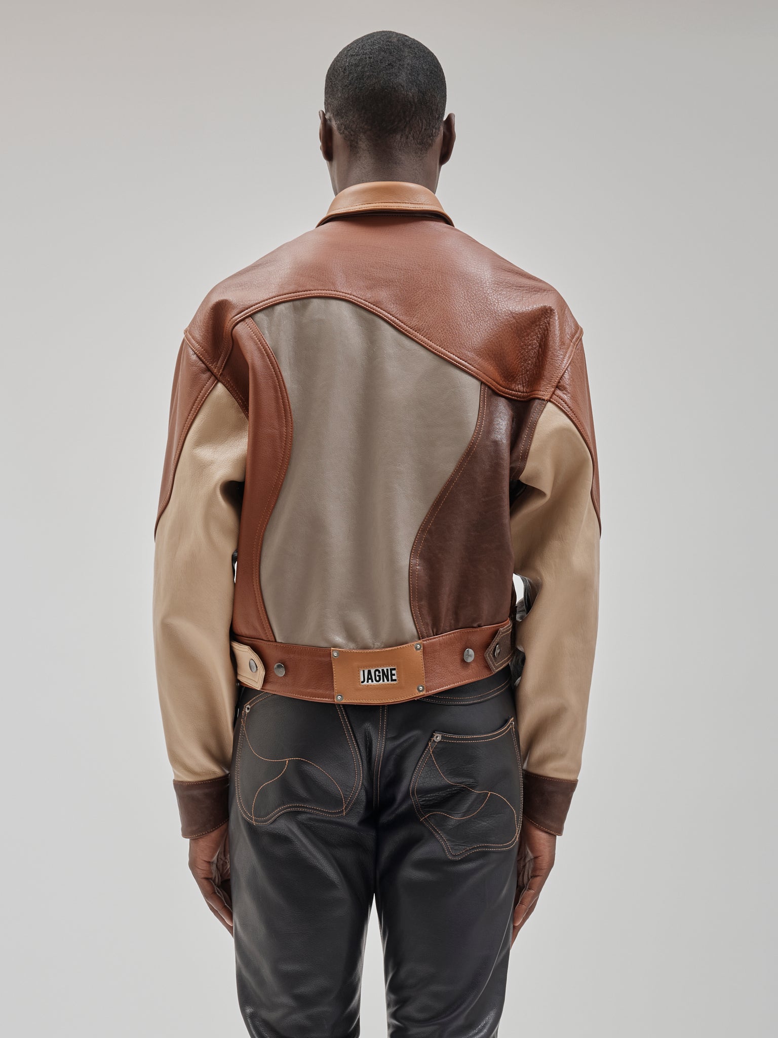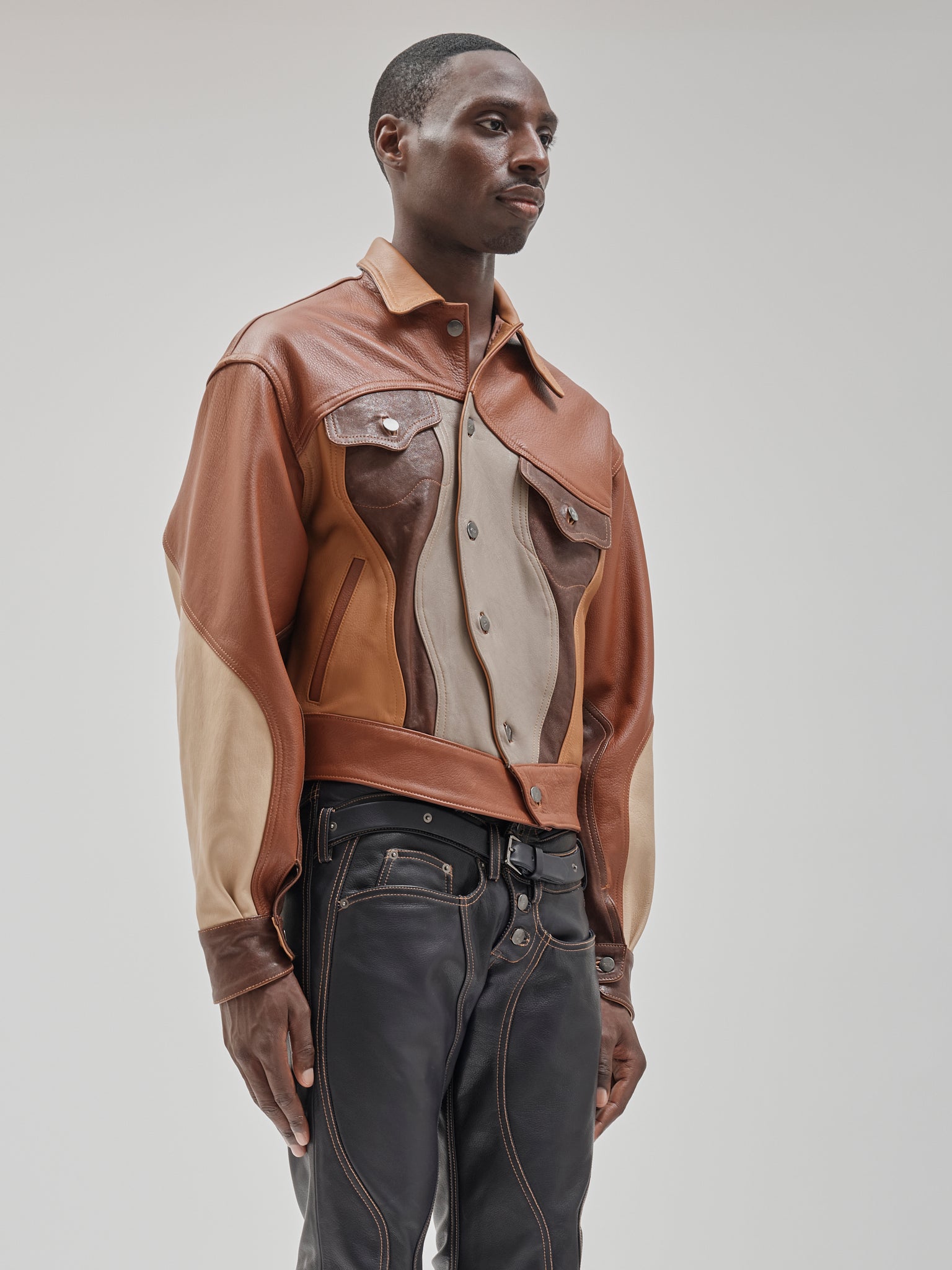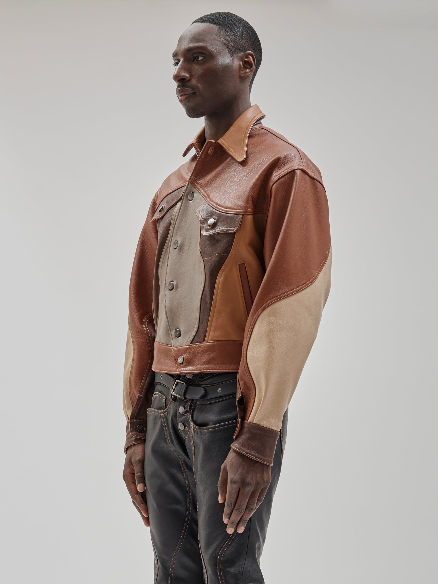 Tonal leather trucker assembled from varied skins. Surface becomes construction. Panelled leather trucker combining tonal hides and grain variation. Sculpted seam placement with shank closure and chest pockets.