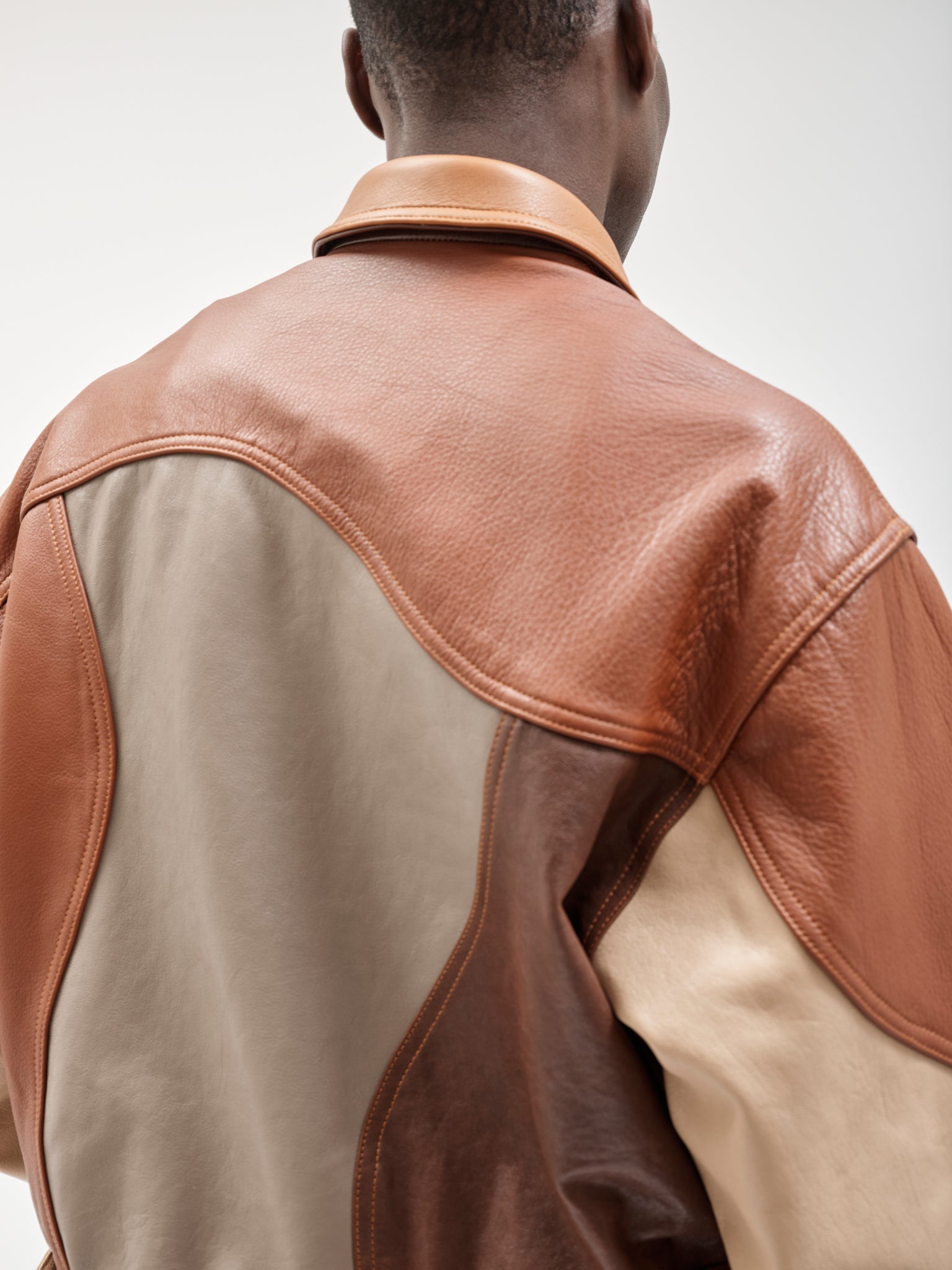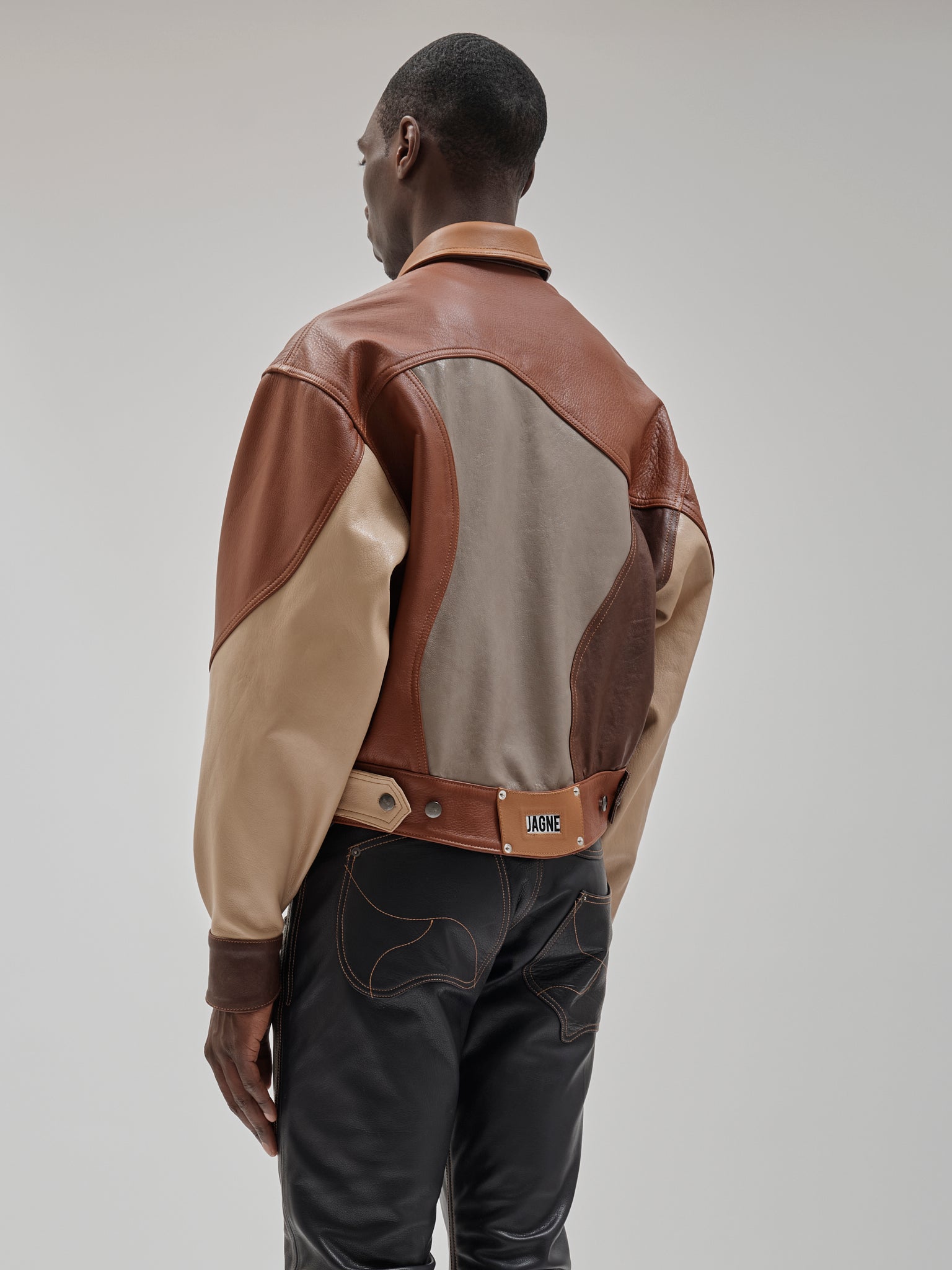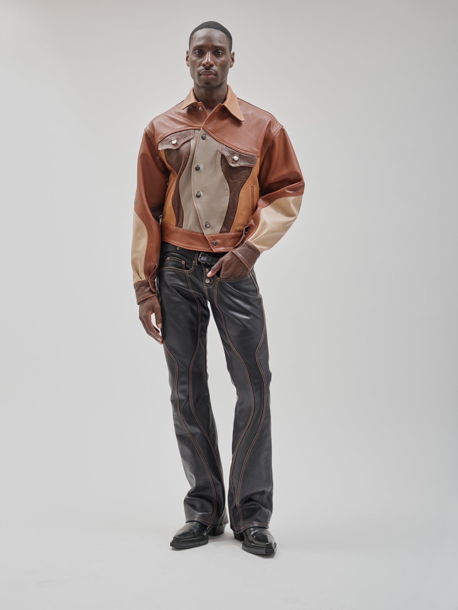 Tonal leather trucker assembled from varied skins. Surface becomes construction. Panelled leather trucker combining tonal hides and grain variation. Sculpted seam placement with shank closure and chest pockets.