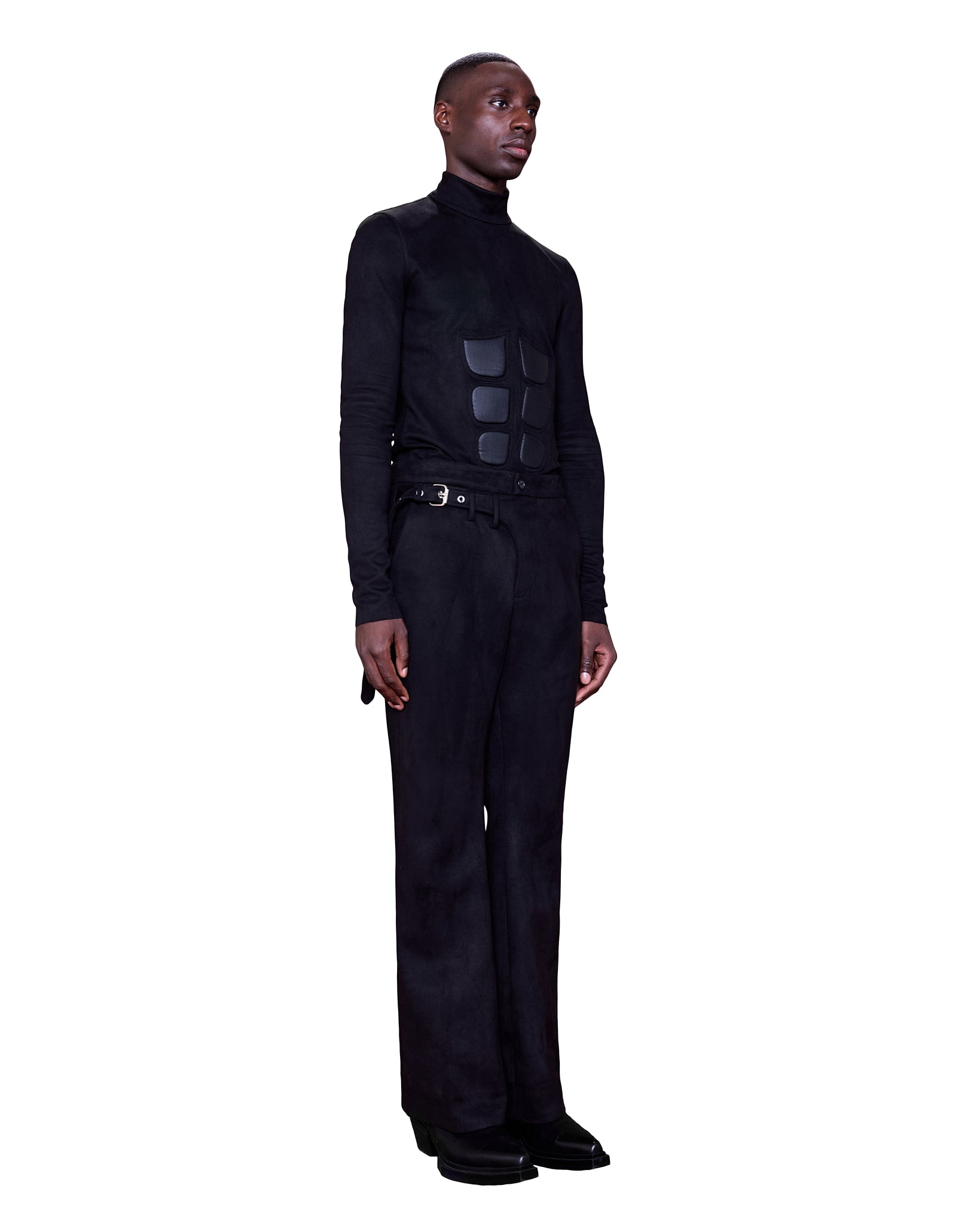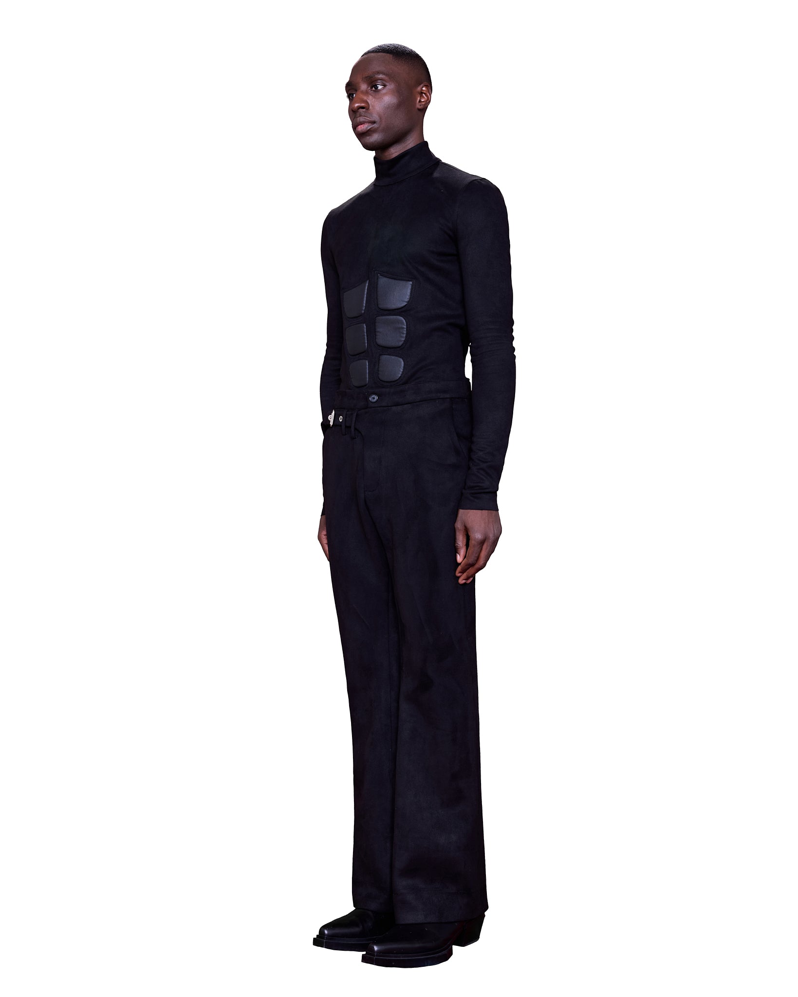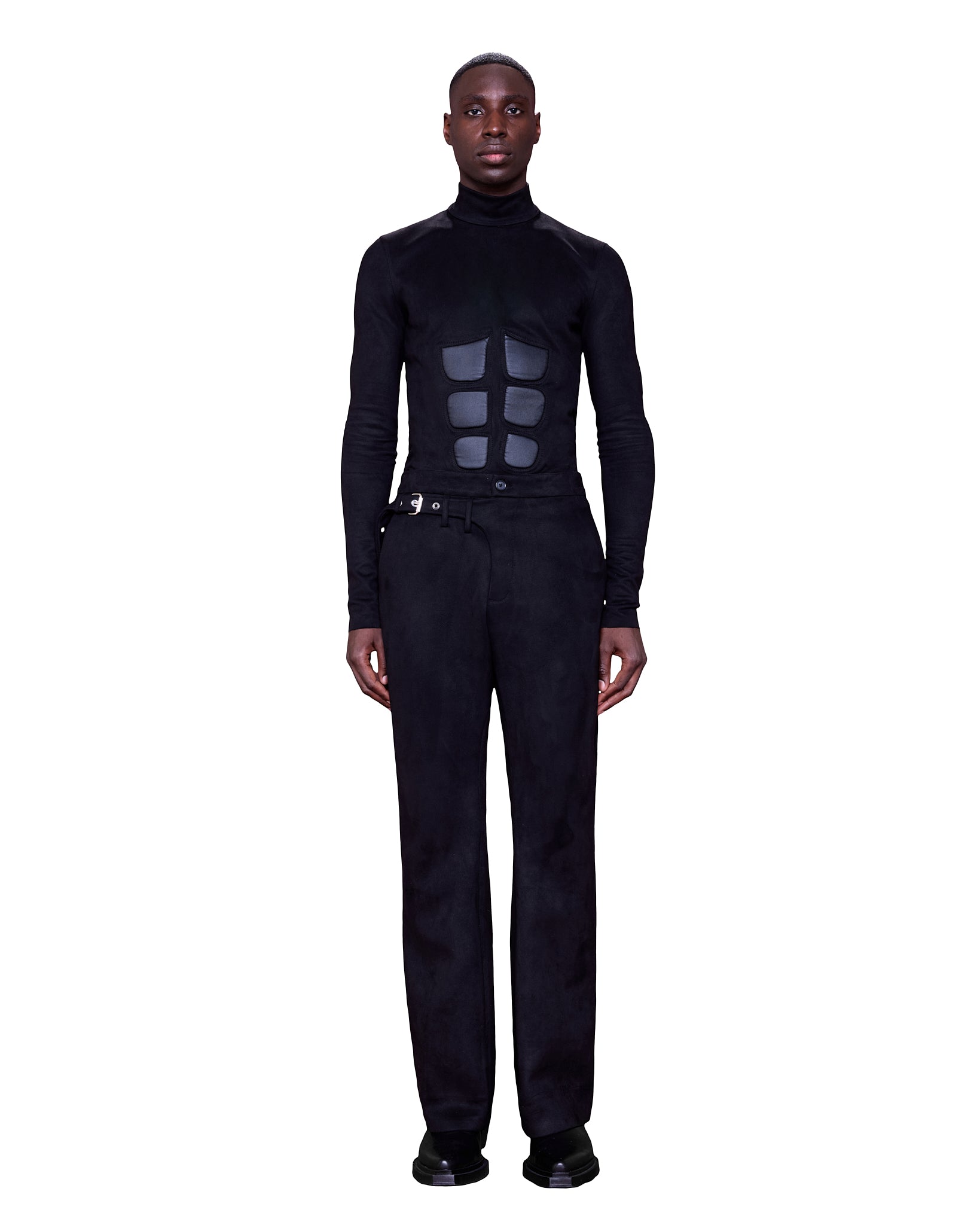 With a high turtleneck and long, slim sleeves, the silhouette is both sleek. The structured chest panels give a muscular, powerful appearance, while the snug fit and streamlined shape emphasize an athletic yet avant-garde look.