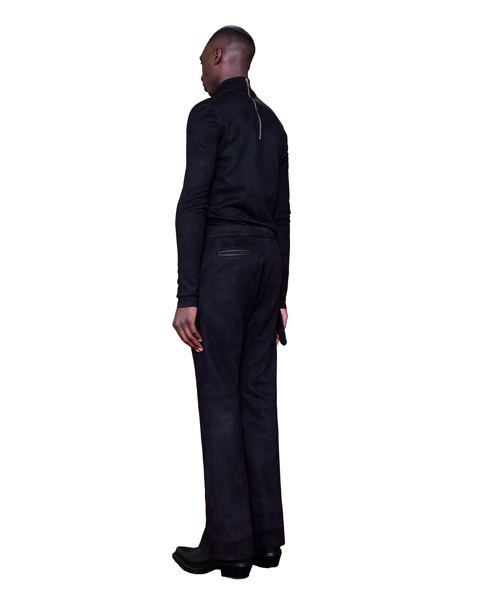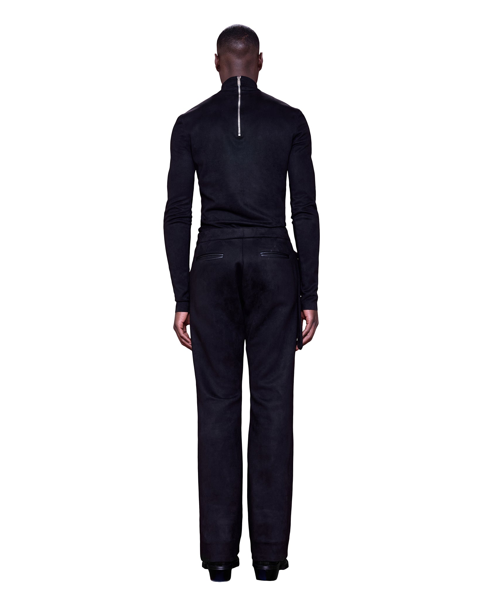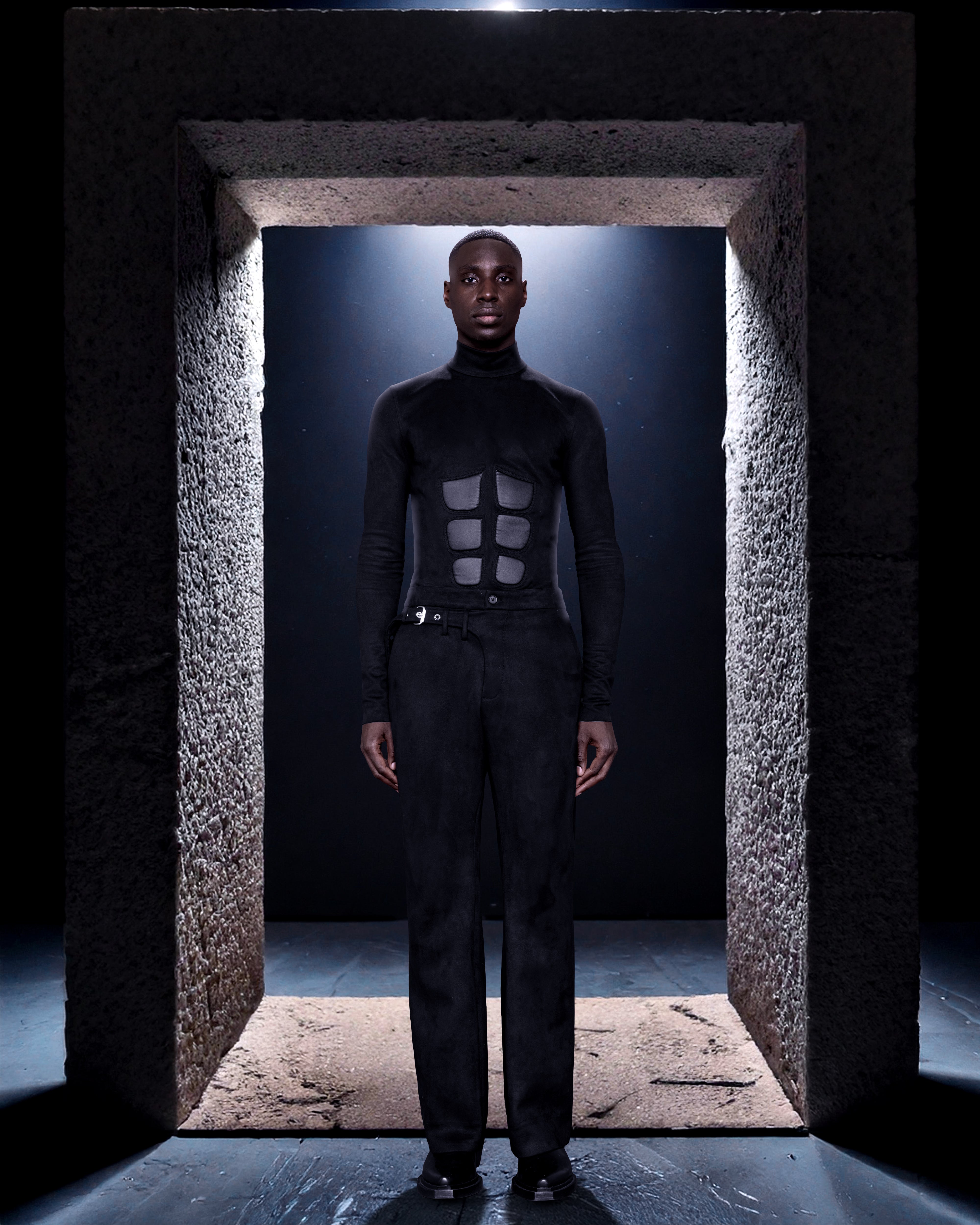 With a high turtleneck and long, slim sleeves, the silhouette is both sleek. The structured chest panels give a muscular, powerful appearance, while the snug fit and streamlined shape emphasize an athletic yet avant-garde look.