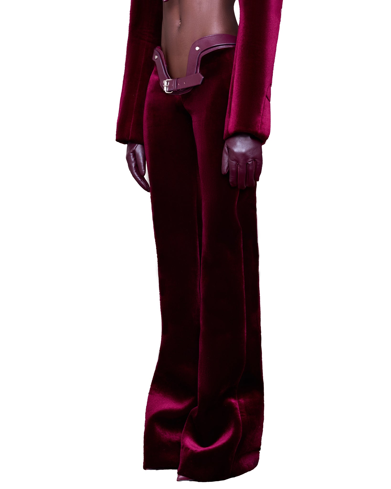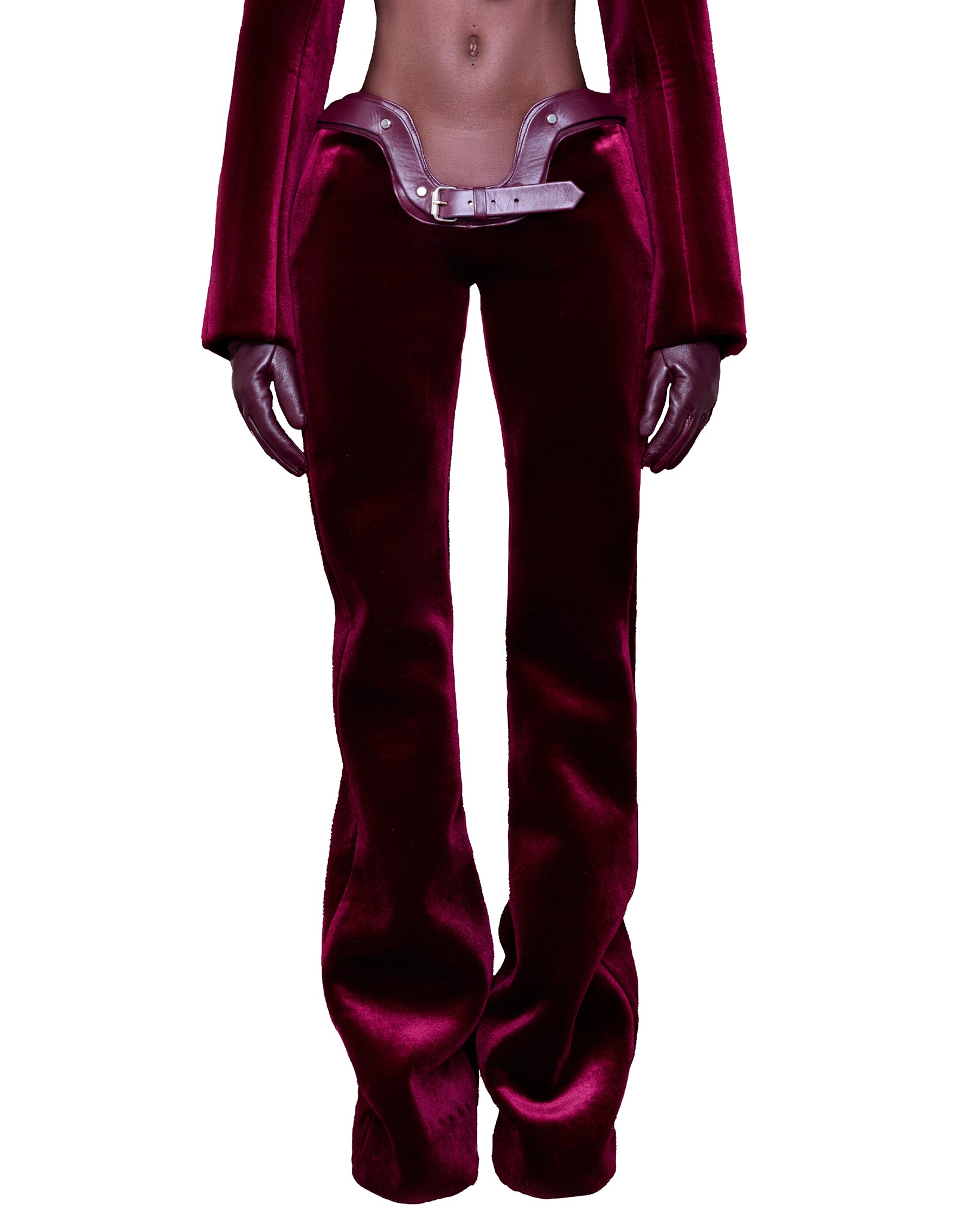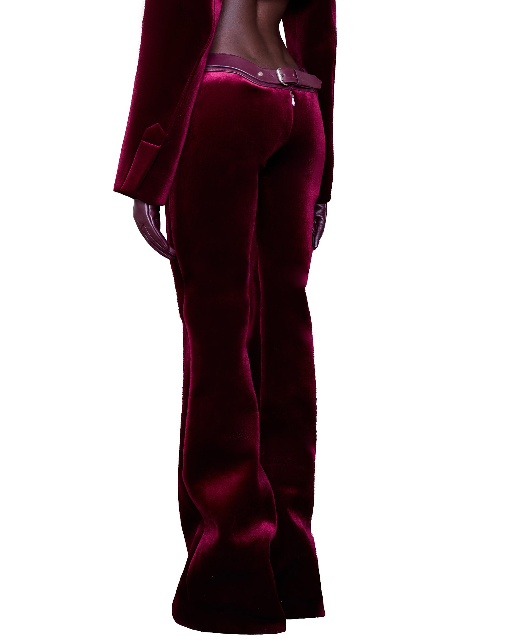 A sleek and sophisticated pair crafted from rich wineberry velvet, featuring a plunging waisted, exaggerated hip  silhouette that flares slightly at the bottom.