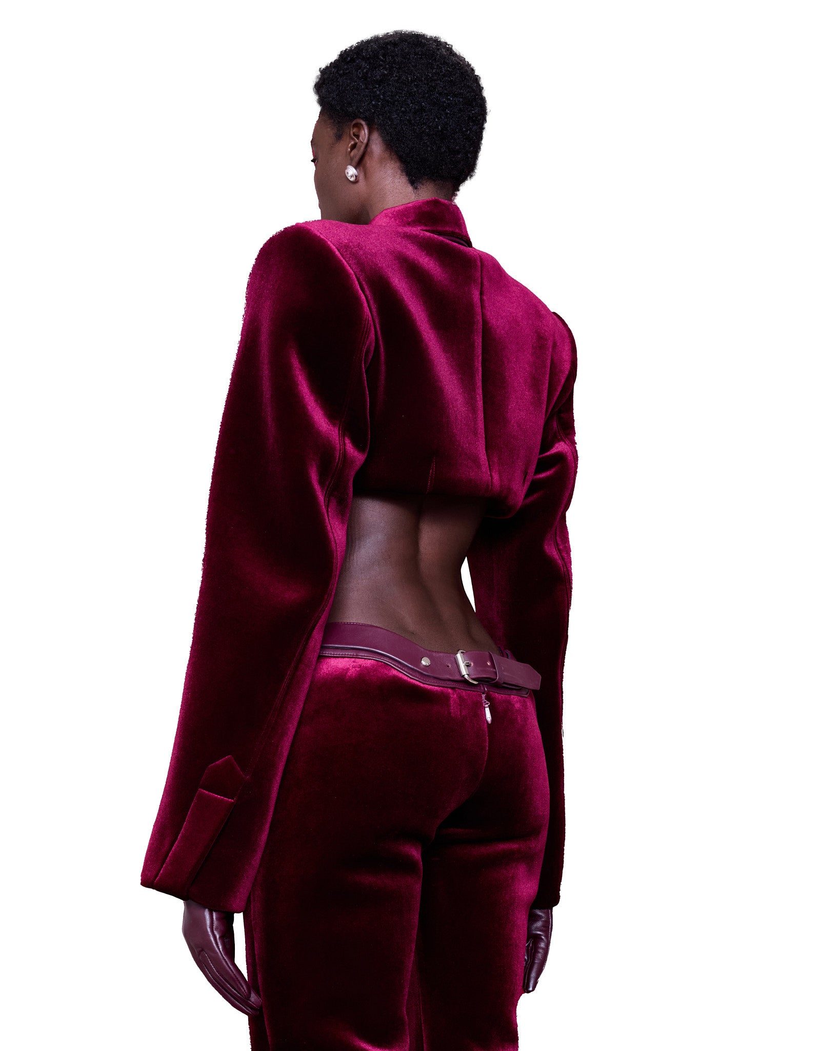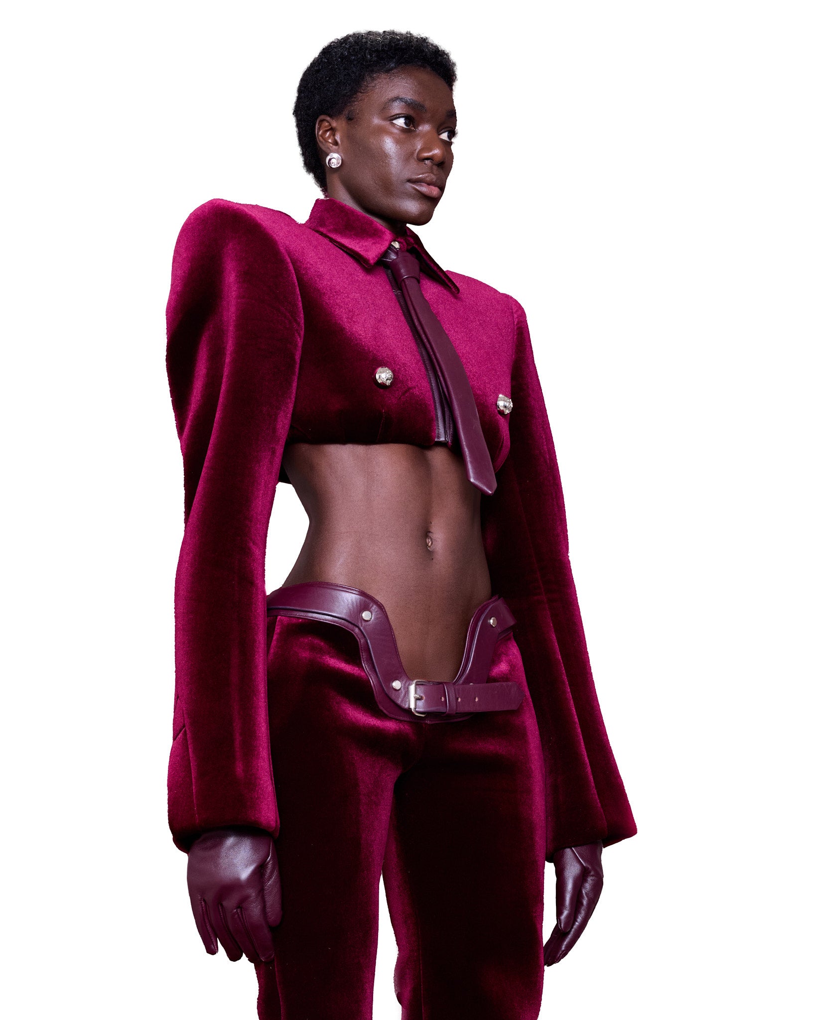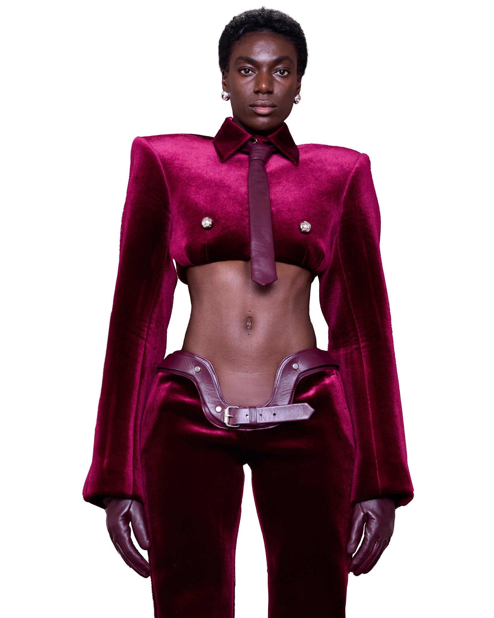 Featuring a structured, cropped silhouette made from a rich wineberry velvet fabric. The shoulders are exaggerated and angular, creating a sharp, powerful shape. The top has a high, pointed collar and is fastened with two prominent, metallic, circular buttons on the chest, resembling decorative elements rather than functional closures. A matching burgundy tie. The sleeves are long and slightly flared at the cuffs, complementing the dramatic structure of the top.