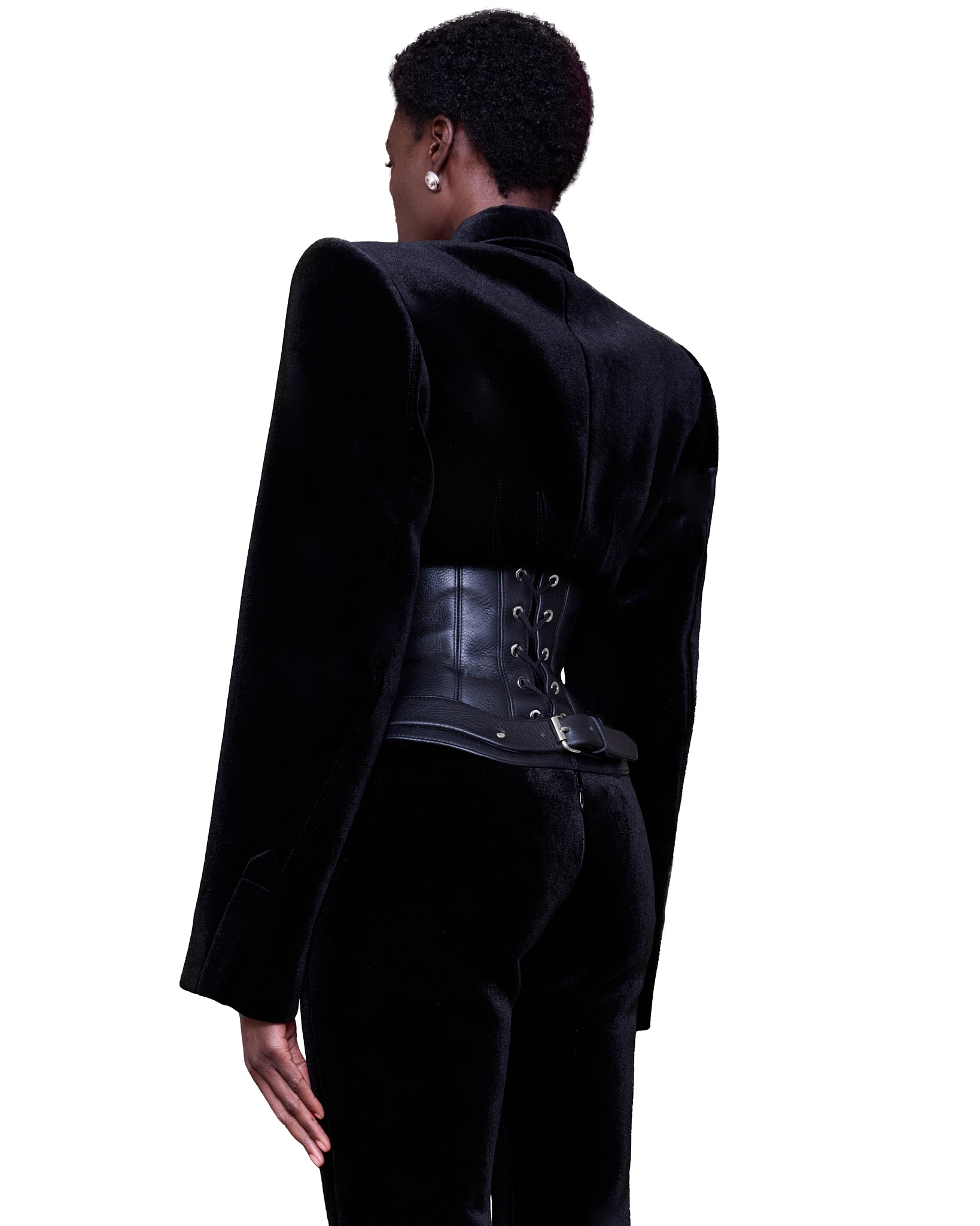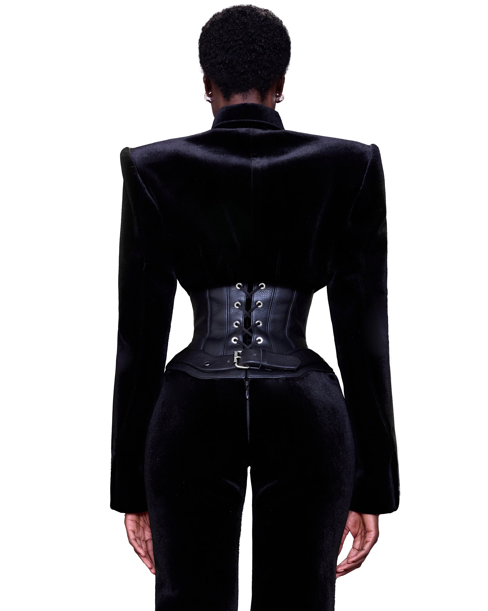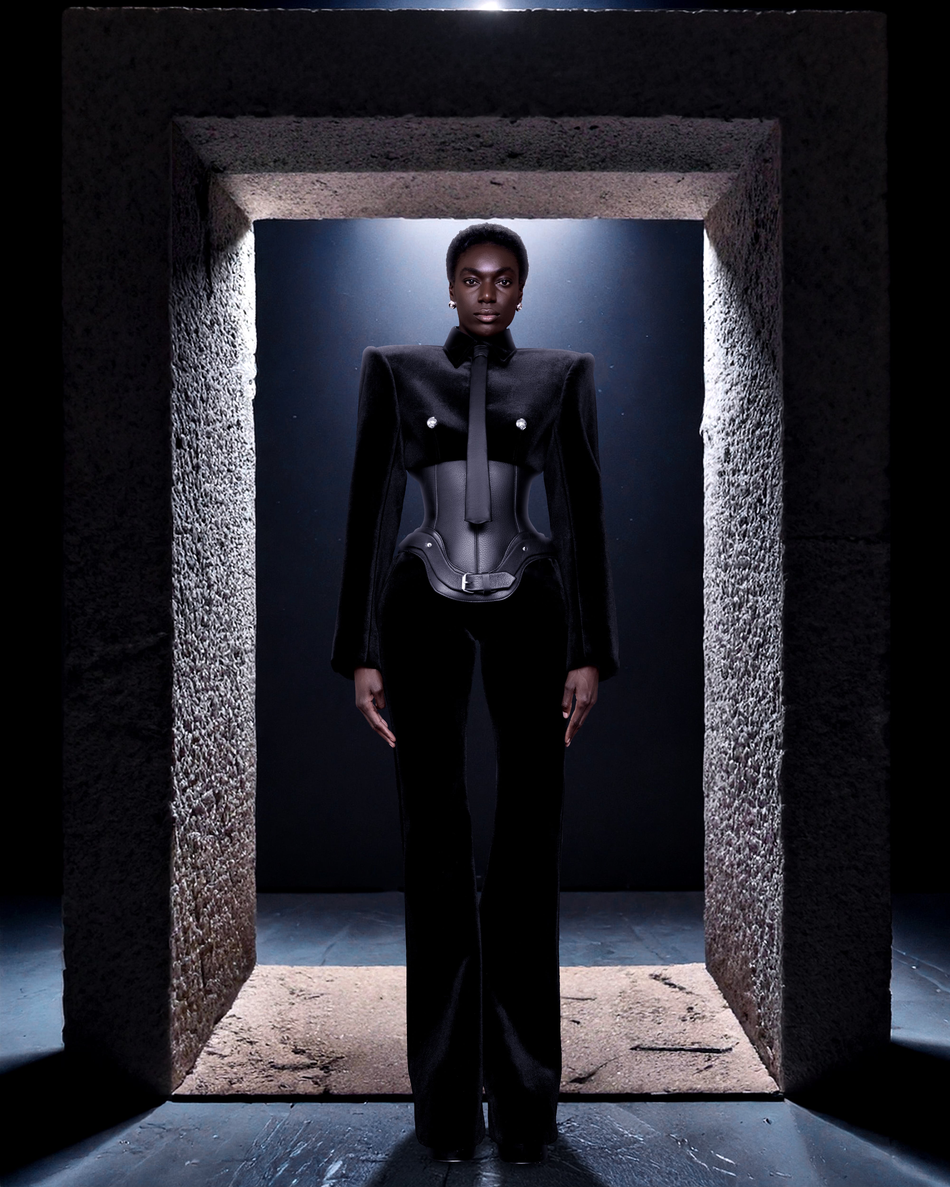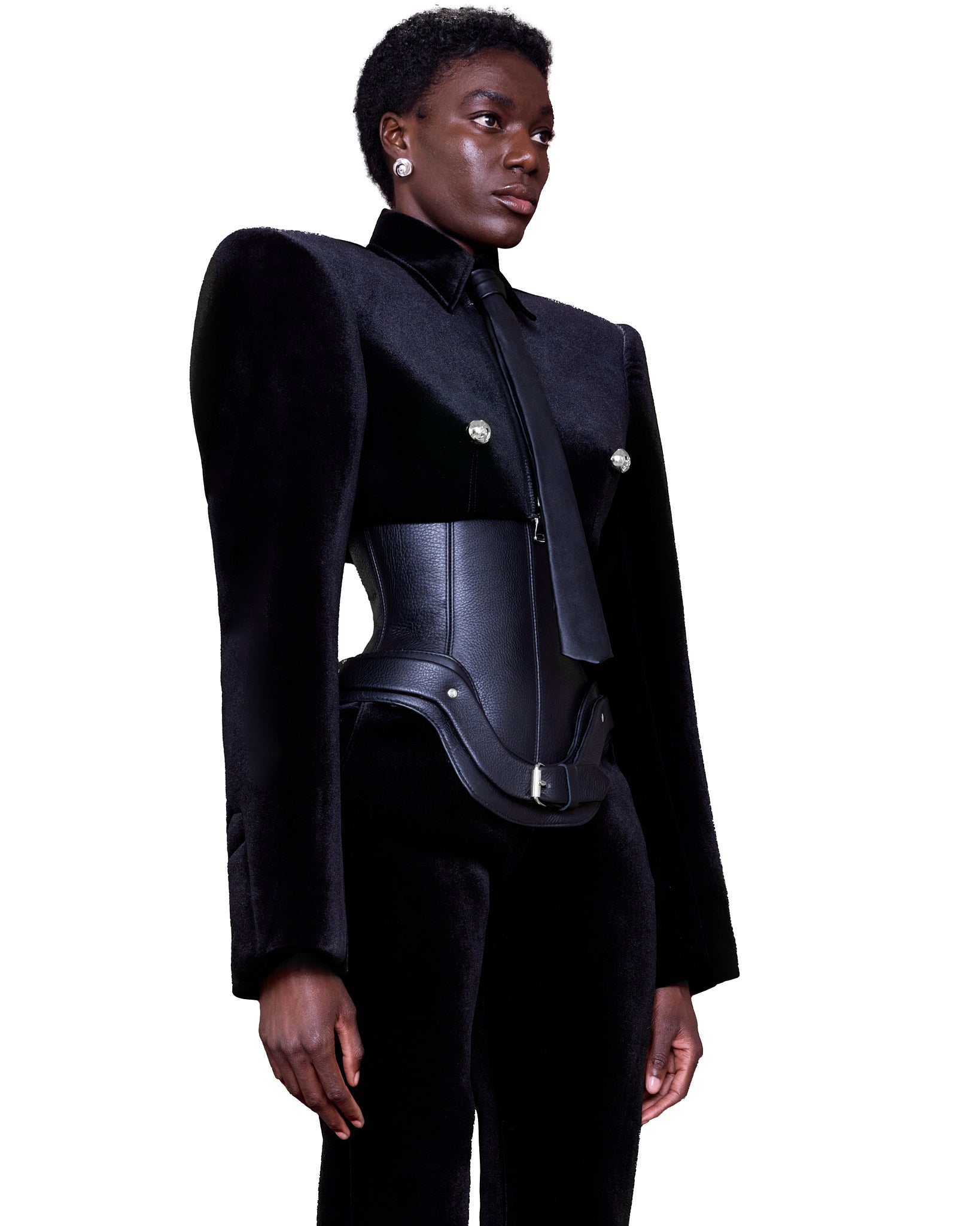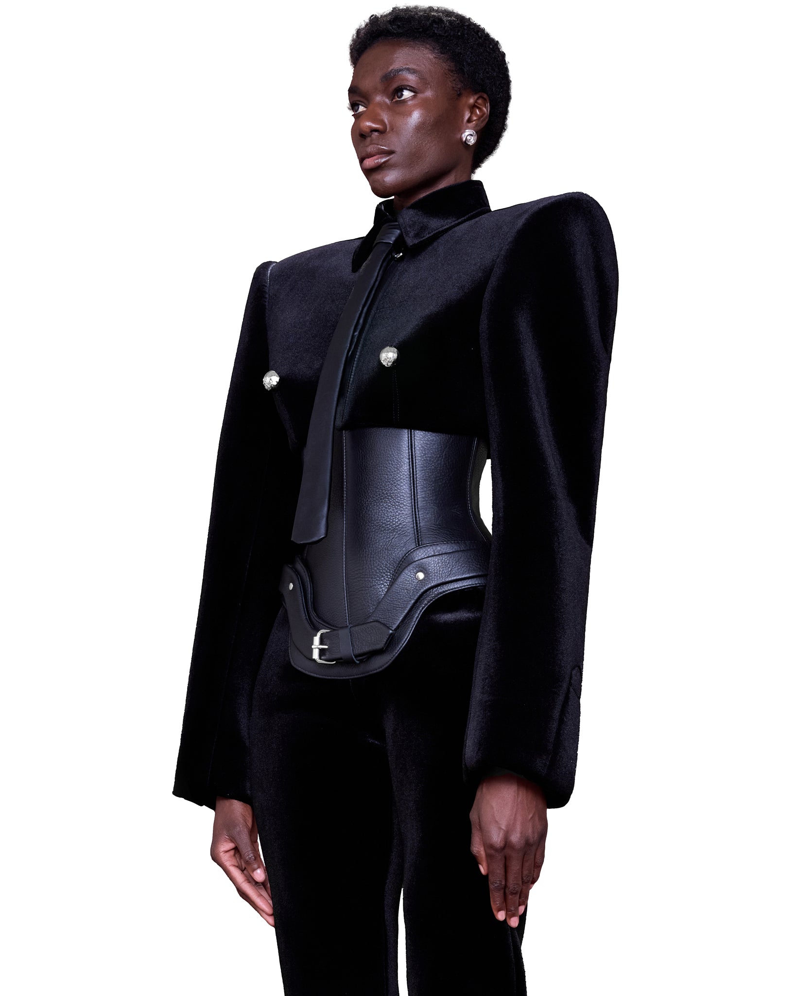 The ensemble is a striking fusion of structured black velvet and sleek leather corset. The sharply tailored blazer features exaggerated, sculptural shoulders and bold metallic buttons, exuding a military-inspired, authoritative presence. A sleek, black leather tie adds a formal yet futuristic touch.