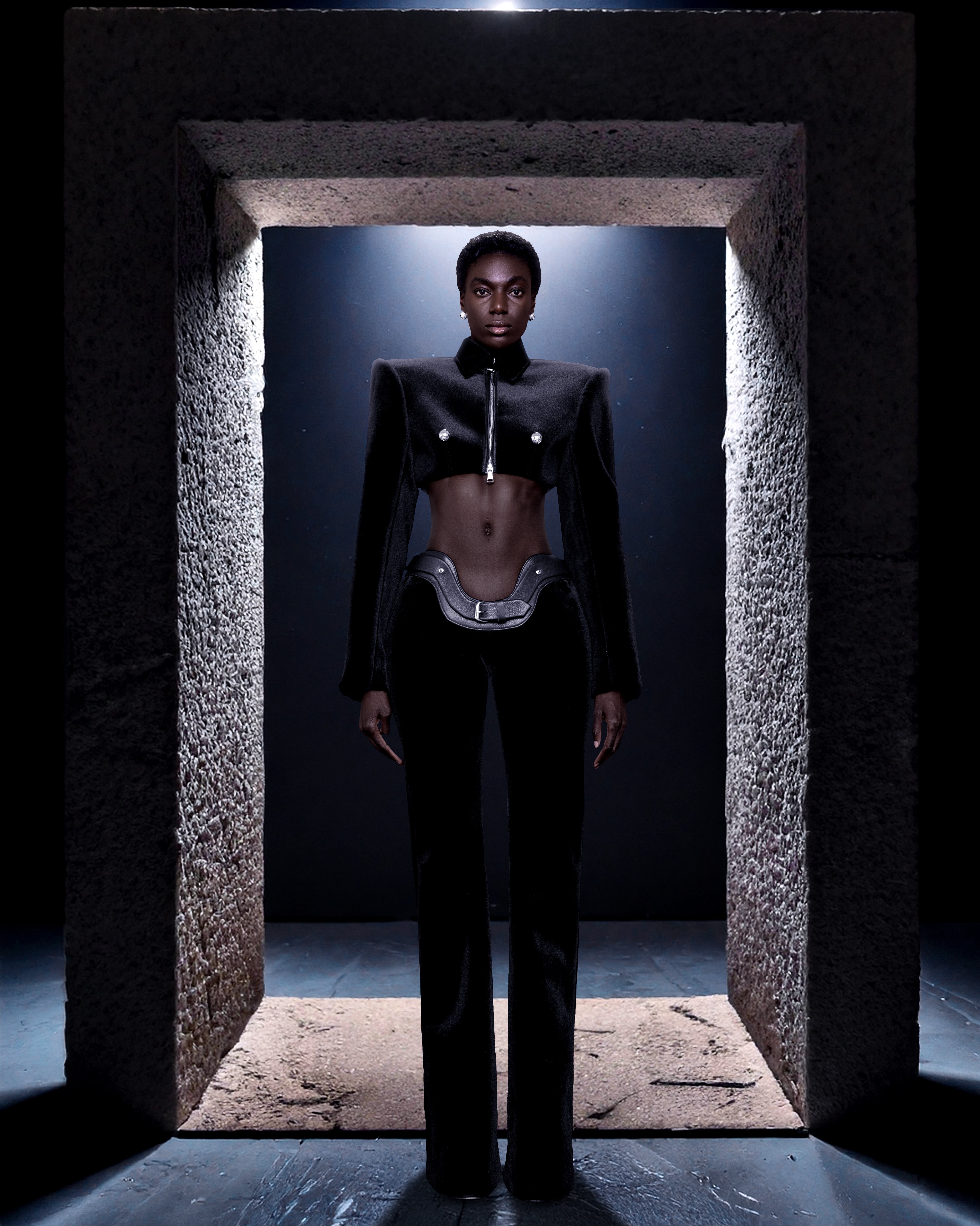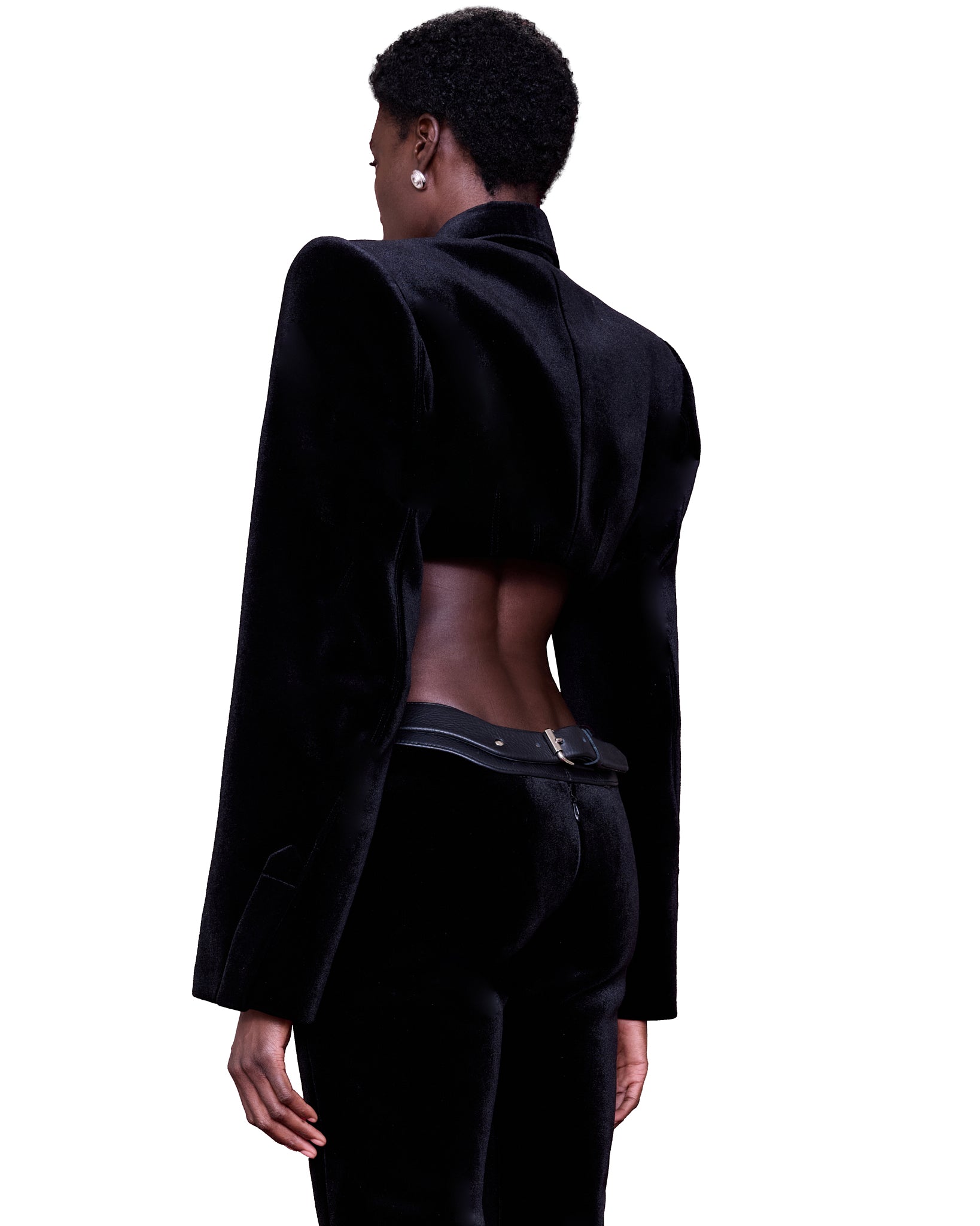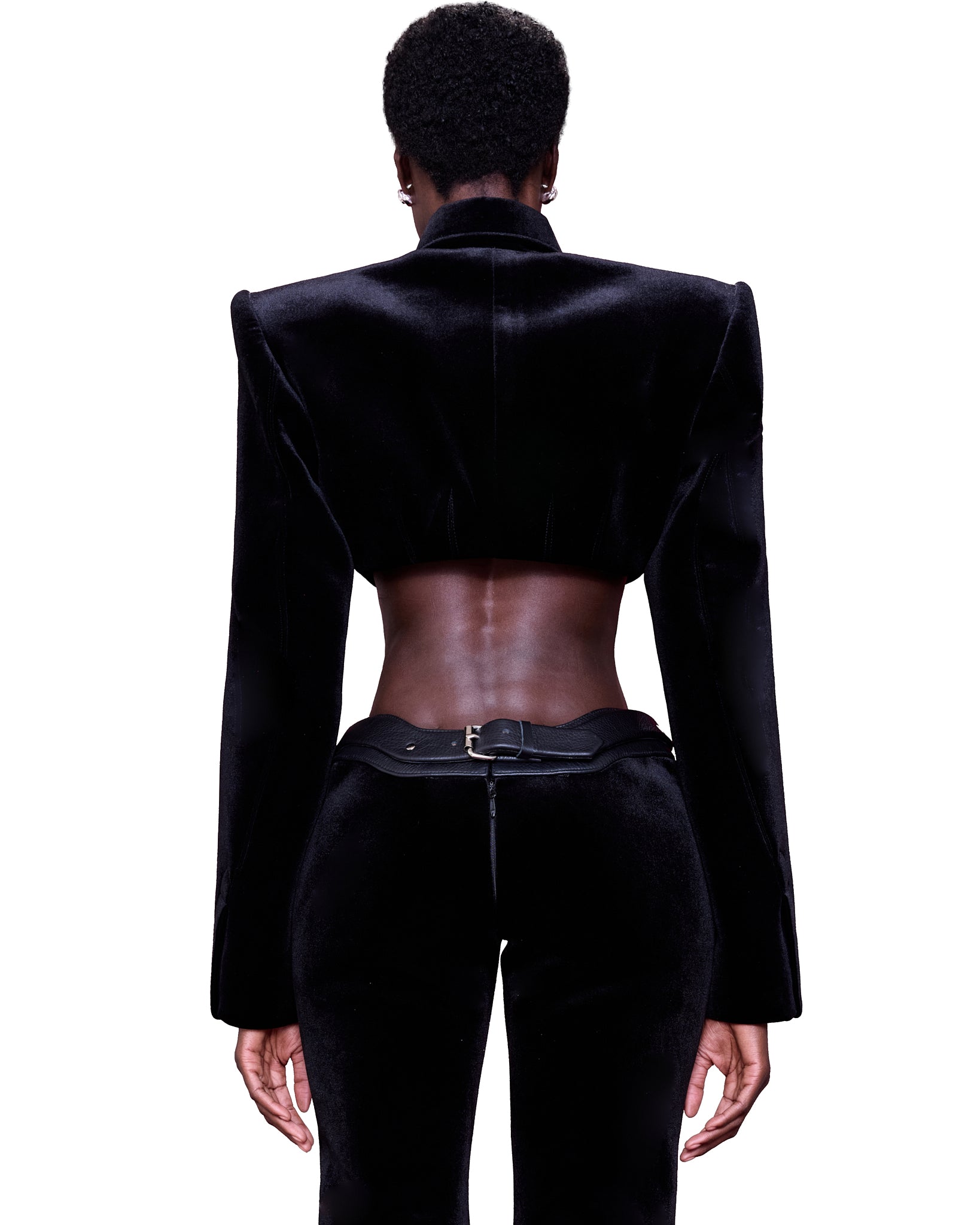 A structured cropped silhouette made from plush black velvet fabric. Featuring a structured collar, exaggerated angular shoulders that create a powerful and commanding silhouette. The front is adorned with a central zipper with two large, statement metal buttons at the chest. Long sculpted sleeves add to the garment’s strong, architectural feel.