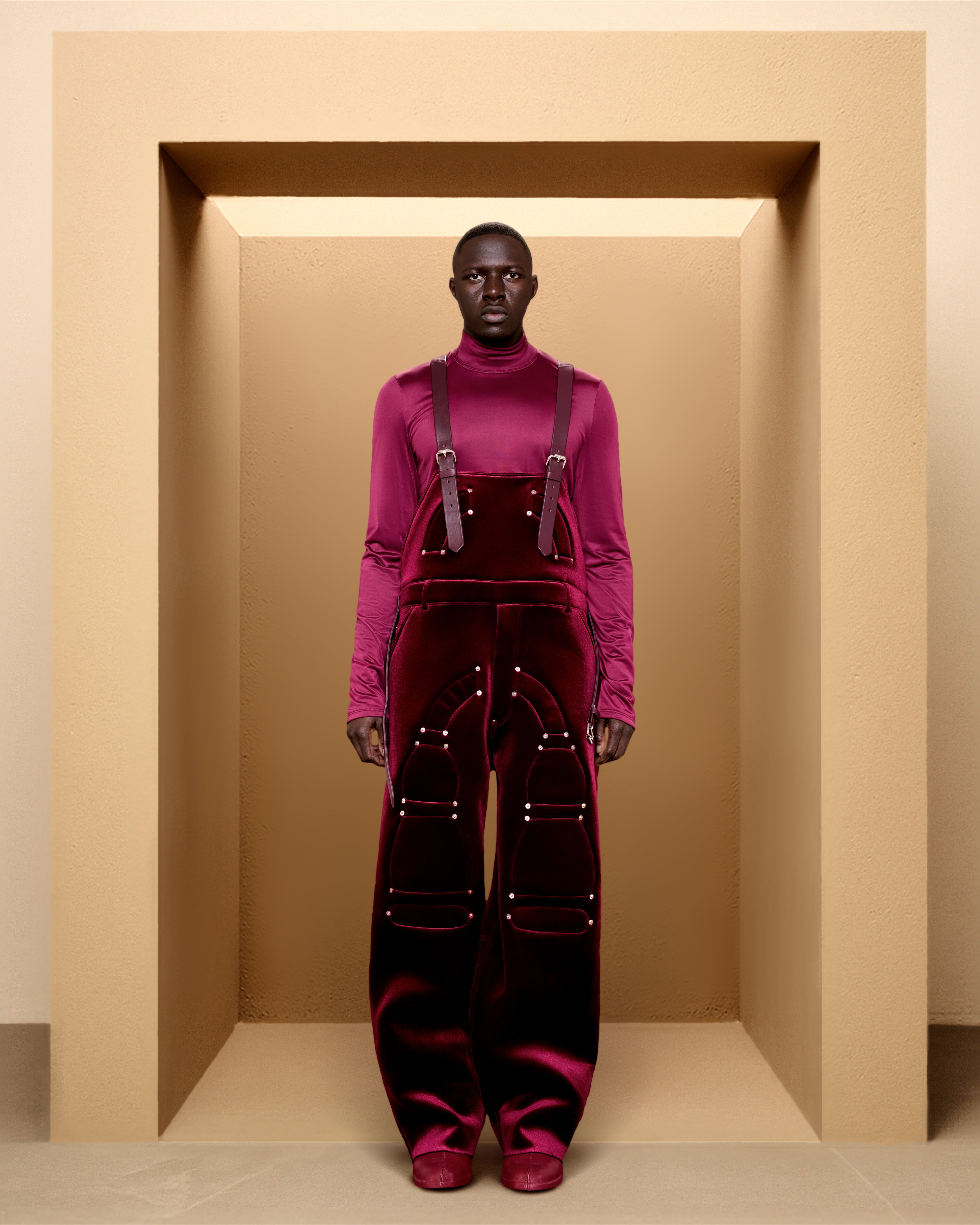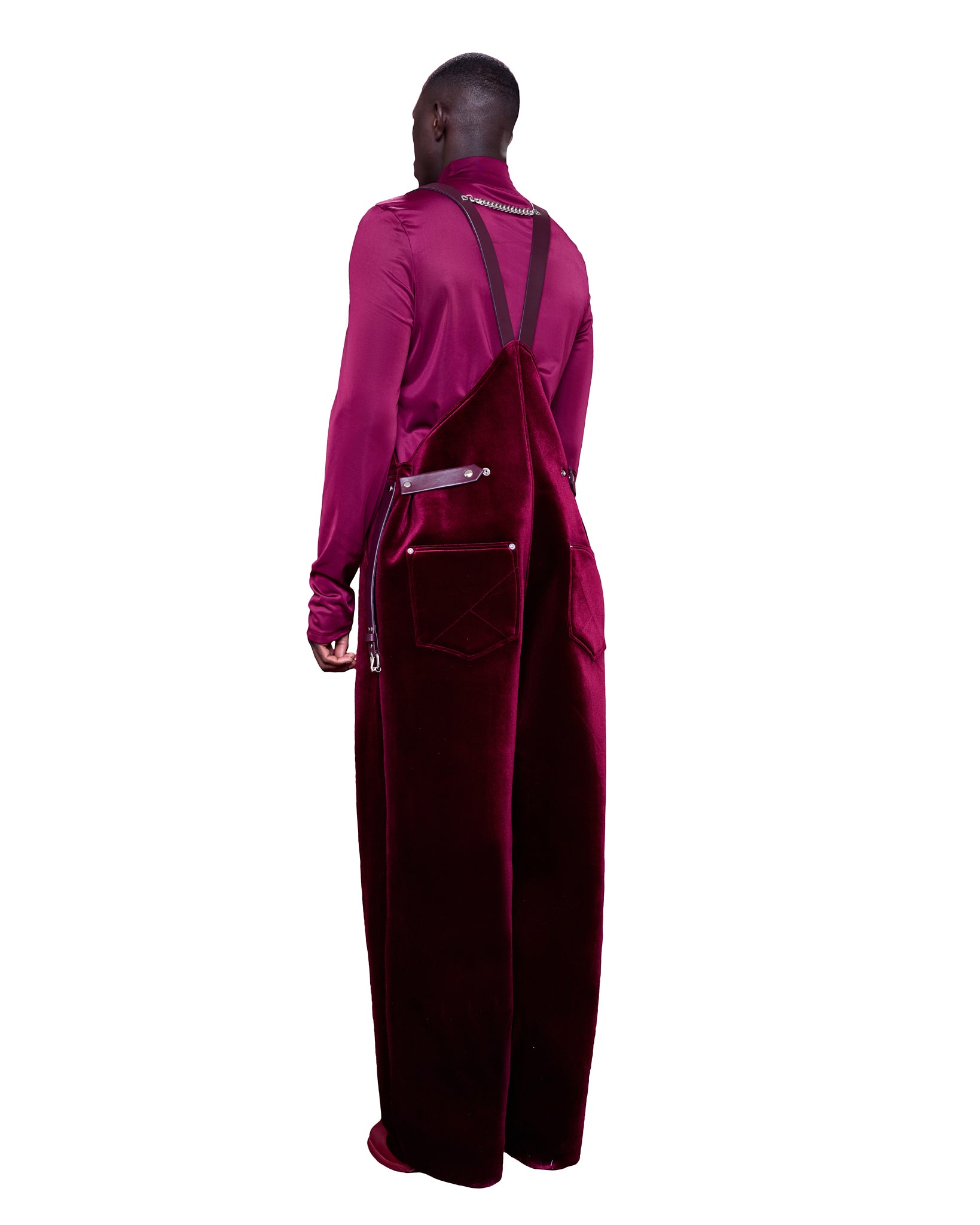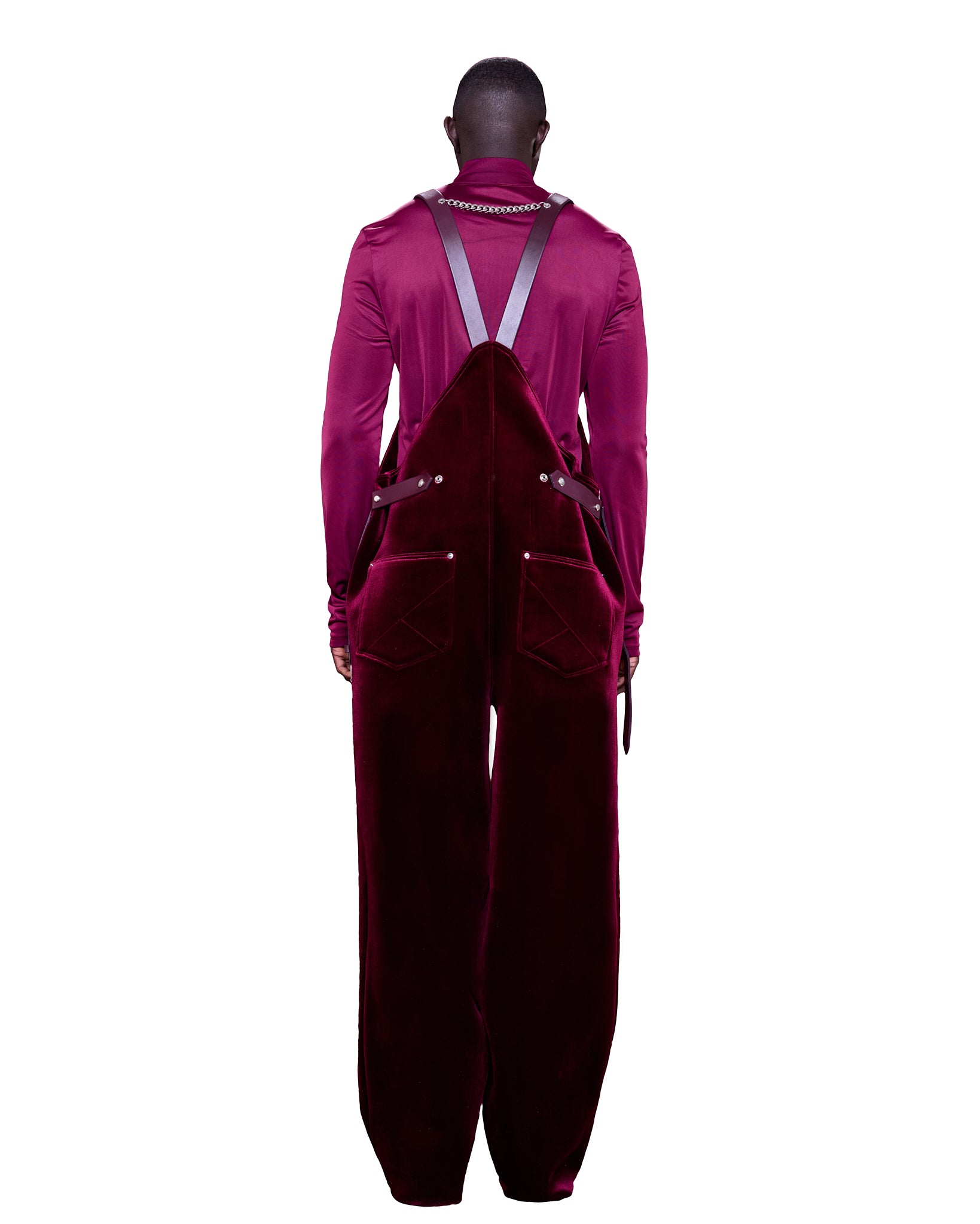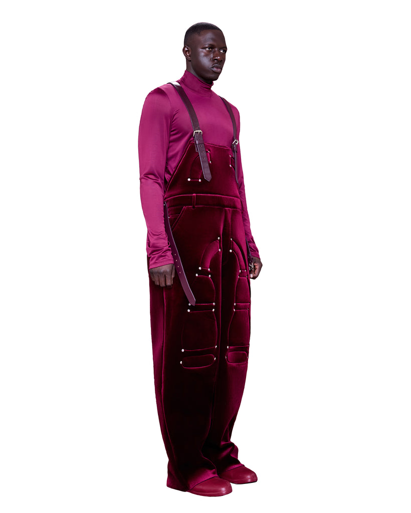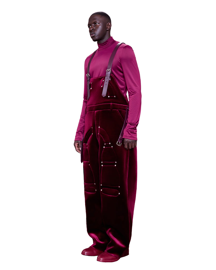 This striking piece is a pair of deep wineberry velvet overalls, elevated by exaggerated volume and architectural detailing. The garment is built with wide-leg proportions and structured contouring panels down the legs, outlined by contrasting topstitching and rivets, evoking a sense of armored softness. The leather suspenders, buckled in utilitarian fashion, add a tactile contrast and industrial edge to the otherwise plush, opulent base.