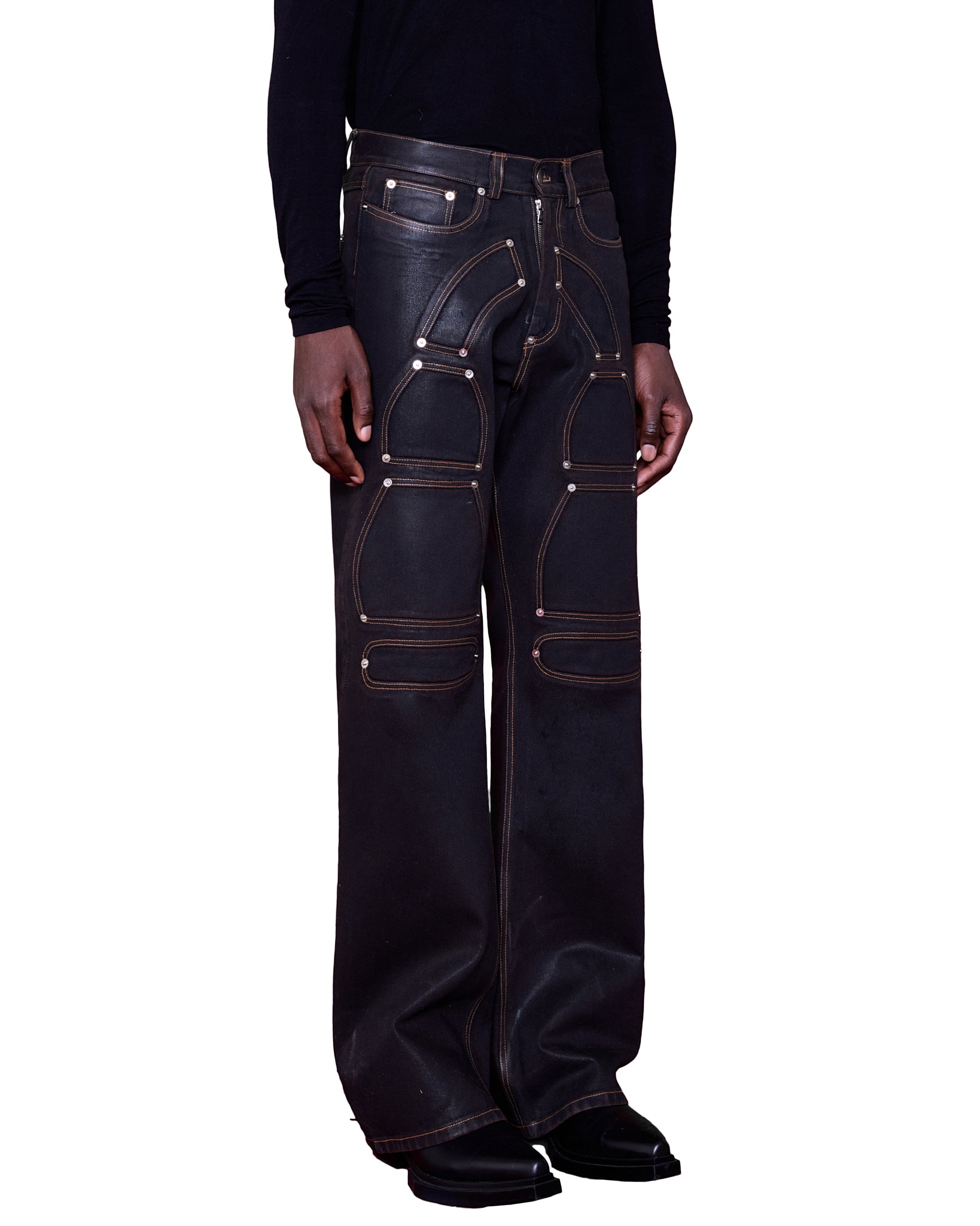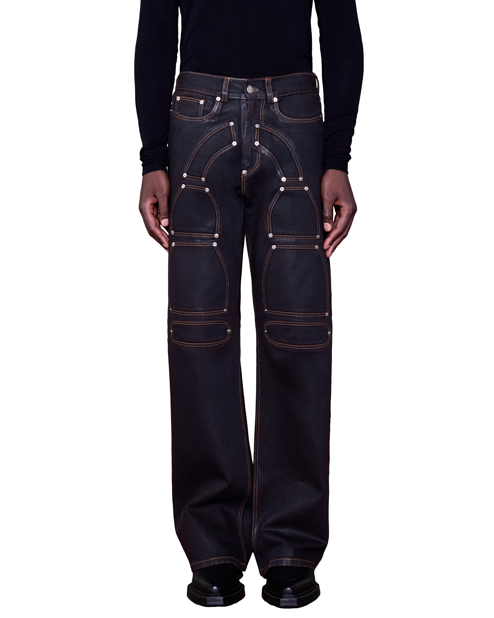 A sculptural take on the classic jean. This five-pocket style features anatomical panel detailing with contrast topstitching and metal rivets. Engineered for structure and presence — a hybrid of denim utility and abstract form.